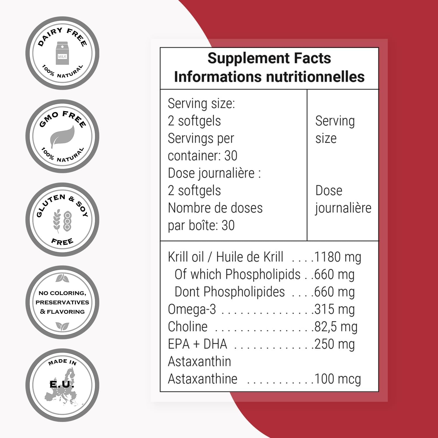 Recommended Use - Take 1 softgel twice a day, with lunch and/or dinner. Each Softgel contains 590mg Krill oil, Euphausia superba. Contains shellfish derivatives