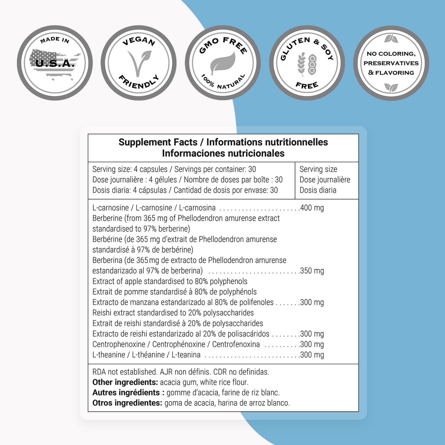 CONTAIN: L-carnosine, Berberine (from 365 mg of Phellodendron amurense extract standardized to 97% berberine), Extract of apple standardized to 80% polyphenols, Extract of reishi standardized to 20% polysaccharides, Centrophenoxine, L-theanine | Other ingredients : Microcrystalline cellulose, magnesium stearate, silicon dioxide