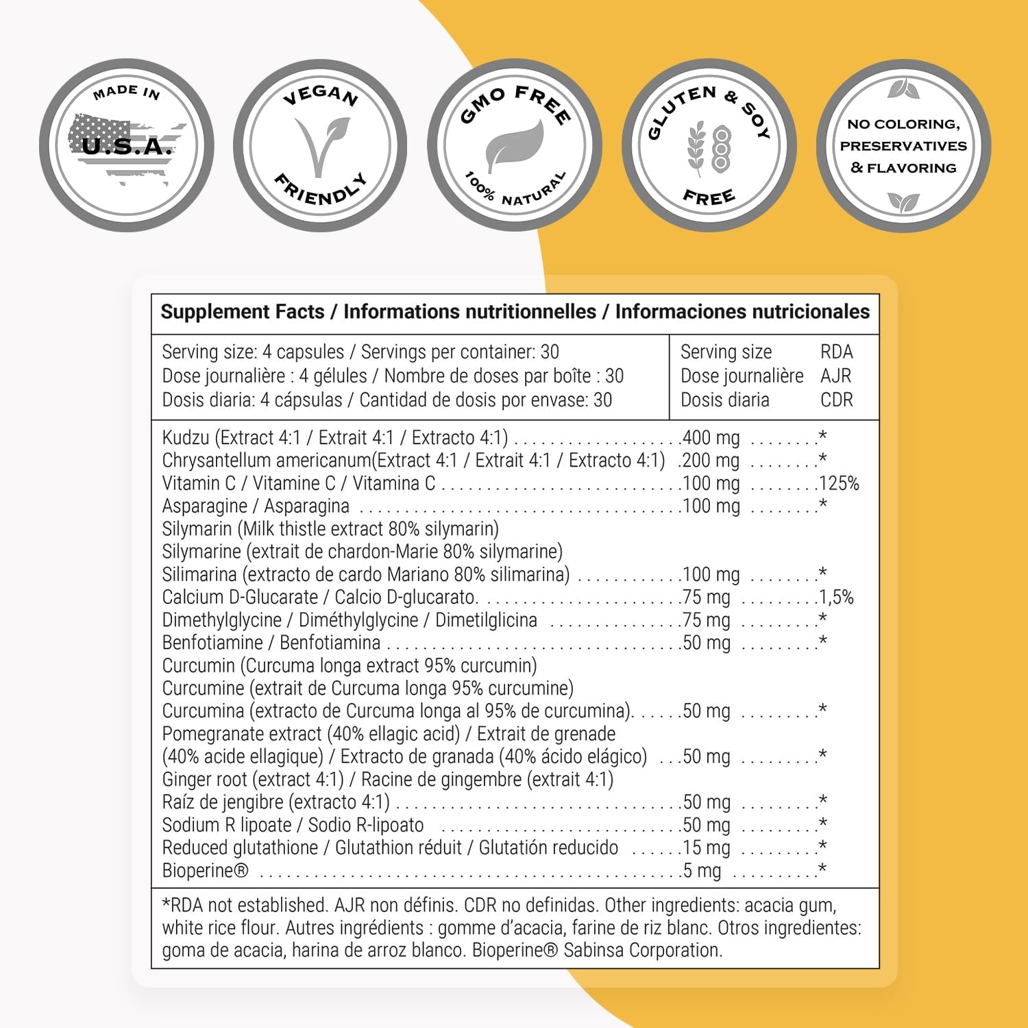 Recommended Use - Take 4 capsules per day. Contains kudzu, chrysantellum americanum, vitamin C, asparagine, milk thistle 80% silymarin, calcium D glucarate, dimethylglycine, benfotiamine, curcuma longa 95% curcumin, pomegranate 40% ellagic acid, ginger root, sodium R-lipoate, reduced glutathione, bioperine | Other ingredient: acacia gum, white rice flour