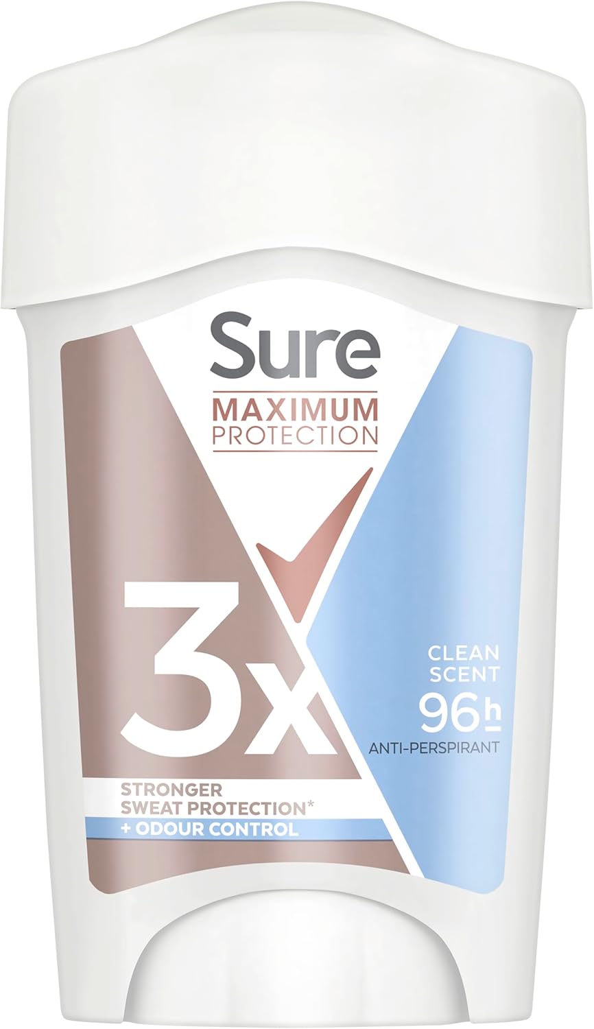 Sure Maximum Protection Clean Scent Anti-Perspirant Cream Women'S Deodorant Stick With 3X Stronger* Sweat Protection For 96 Hour Sweat And Odour Protection 45 Ml