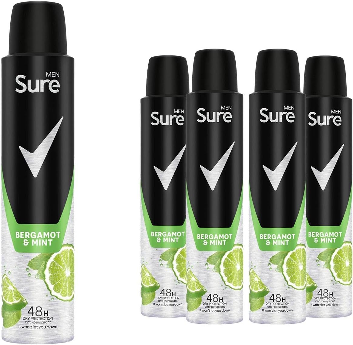 Sure Men Anti Perspirant Deodorant Bergamot & Mint, Pack Of 5, Alcohol Free Deodorant Spray For Men With Energising Scent Provides 48-Hour Odour Control, 200Ml