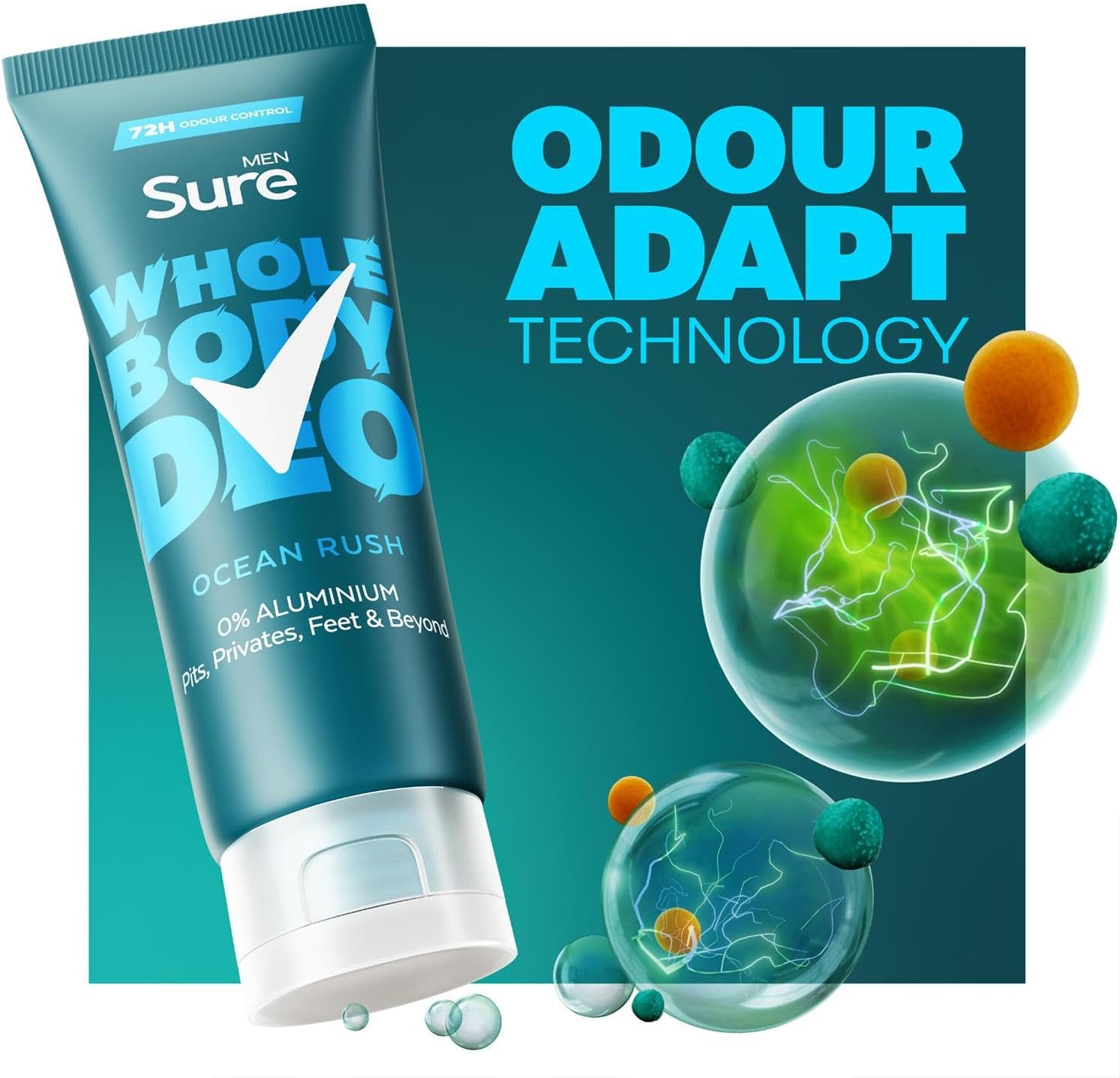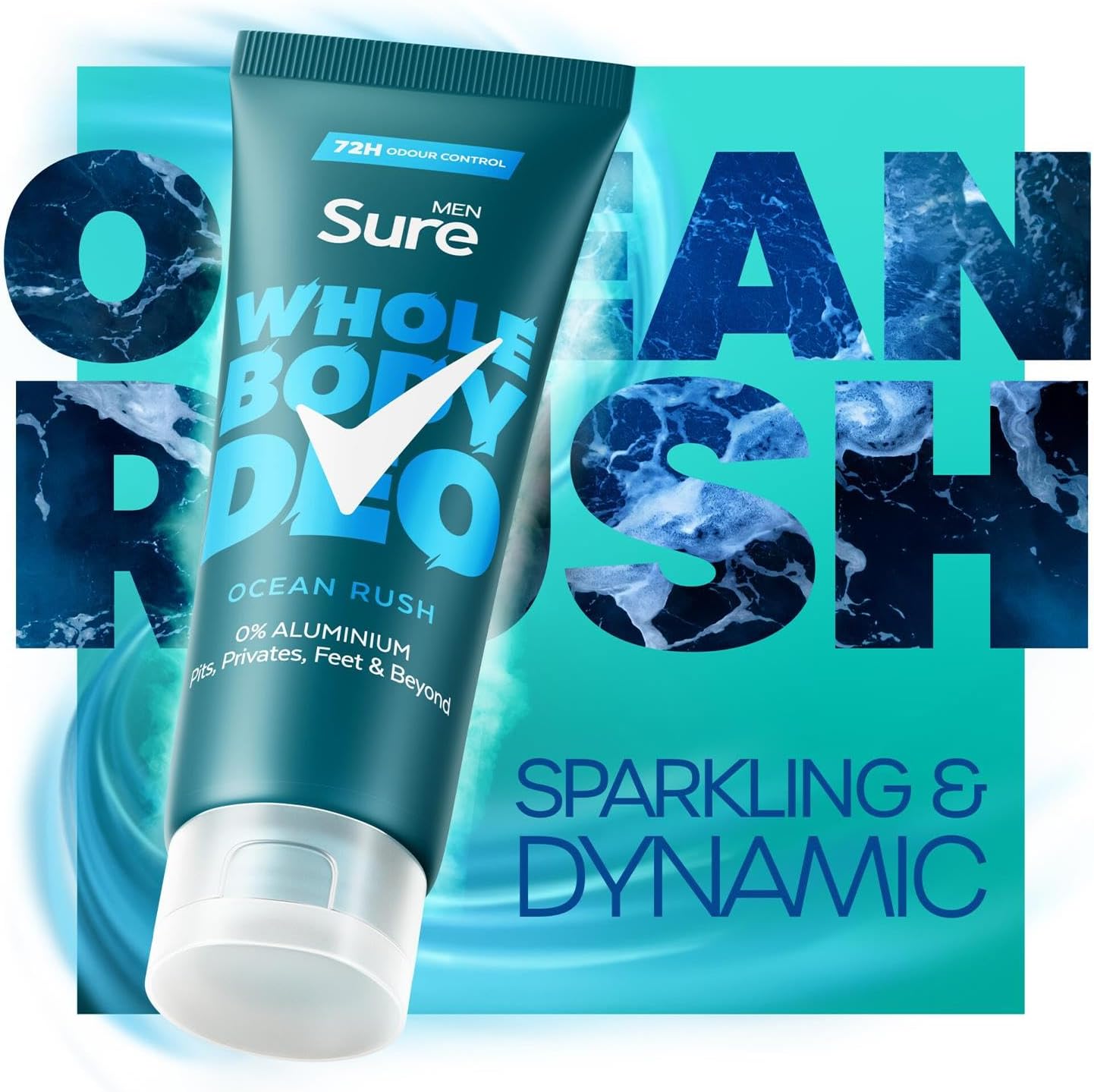 Sure Men Deodorant Cream Ocean Rush, Pack Of 6, Whole Body Deodorant For Men Aluminium Free Deo Cream With Herbal And Woody Scent Provides 72-Hour Odour Control, 75 Ml