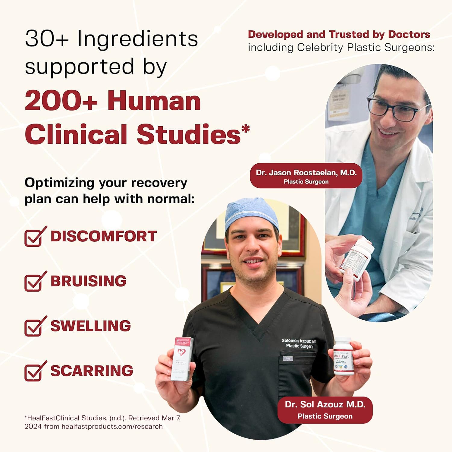 About this item OPTIMIZE RECOVERY - Perfect for surgery & injury. Filled with vitamins, minerals, probiotics, antioxidants, amino acids, and more to optimize your chances of a fast and strong recovery PHYSICIAN-MADE, SURGERY-SAFE FORMULA W/ REQUIRED SURGERY-LEVEL DOSAGES - Premium, highly absorbable nutrition: Amino Acids, Antioxidants, Probiotics, Vitamins & Minerals shown to aid recovery. Flavorless, easy to consume supplement pills. No unpalatable or messy shakes MAXIMIZE NUTRITIONAL STATUS & PREVENT DEPLETION OF KEY NUTRIENTS - Help reduce surgical recovery complications with the EFFECTIVE DOSAGES REQUIRED per the human clinical trials. Separated into Pre-Op & Post-Op regimens for optimal safety & results SURGERY-SAFE, SURGEON & ANESTHESIOLOGIST APPROVED RECOVERY VITAMIN - HealFast is the industry leading surgery supplement backed by a network of physicians to provide a fast recovery NO PLACEBO-LEVEL DOSAGES, PSEUDOSCIENCE OR HIDDEN PROPRIETARY INGREDIENTS - Know what's in your supplement! HealFast surgery supplements are made in a US FDA-Registered Facility & triple tested under USP standards for additional safety See more product details,OPTIMIZE RECOVERY - Perfect for surgery & injury. Filled with vitamins, minerals, probiotics, antioxidants, amino acids, and more to optimize your chances of a fast and strong recovery,PHYSICIAN-MADE, SURGERY-SAFE FORMULA W/ REQUIRED SURGERY-LEVEL DOSAGES - Premium, highly absorbable nutrition: Amino Acids, Antioxidants, Probiotics, Vitamins & Minerals shown to aid recovery. Flavorless, easy to consume supplement pills. No unpalatable or messy shakes,MAXIMIZE NUTRITIONAL STATUS & PREVENT DEPLETION OF KEY NUTRIENTS - Help reduce surgical recovery complications with the EFFECTIVE DOSAGES REQUIRED per the human clinical trials. Separated into Pre-Op & Post-Op regimens for optimal safety & results,SURGERY-SAFE, SURGEON & ANESTHESIOLOGIST APPROVED RECOVERY VITAMIN - HealFast is the industry leading surgery supplement backed by a network of physicians to provide a fast recovery,NO PLACEBO-LEVEL DOSAGES, PSEUDOSCIENCE OR HIDDEN PROPRIETARY INGREDIENTS - Know what's in your supplement! HealFast surgery supplements are made in a US FDA-Registered Facility & triple tested under USP standards for additional safety