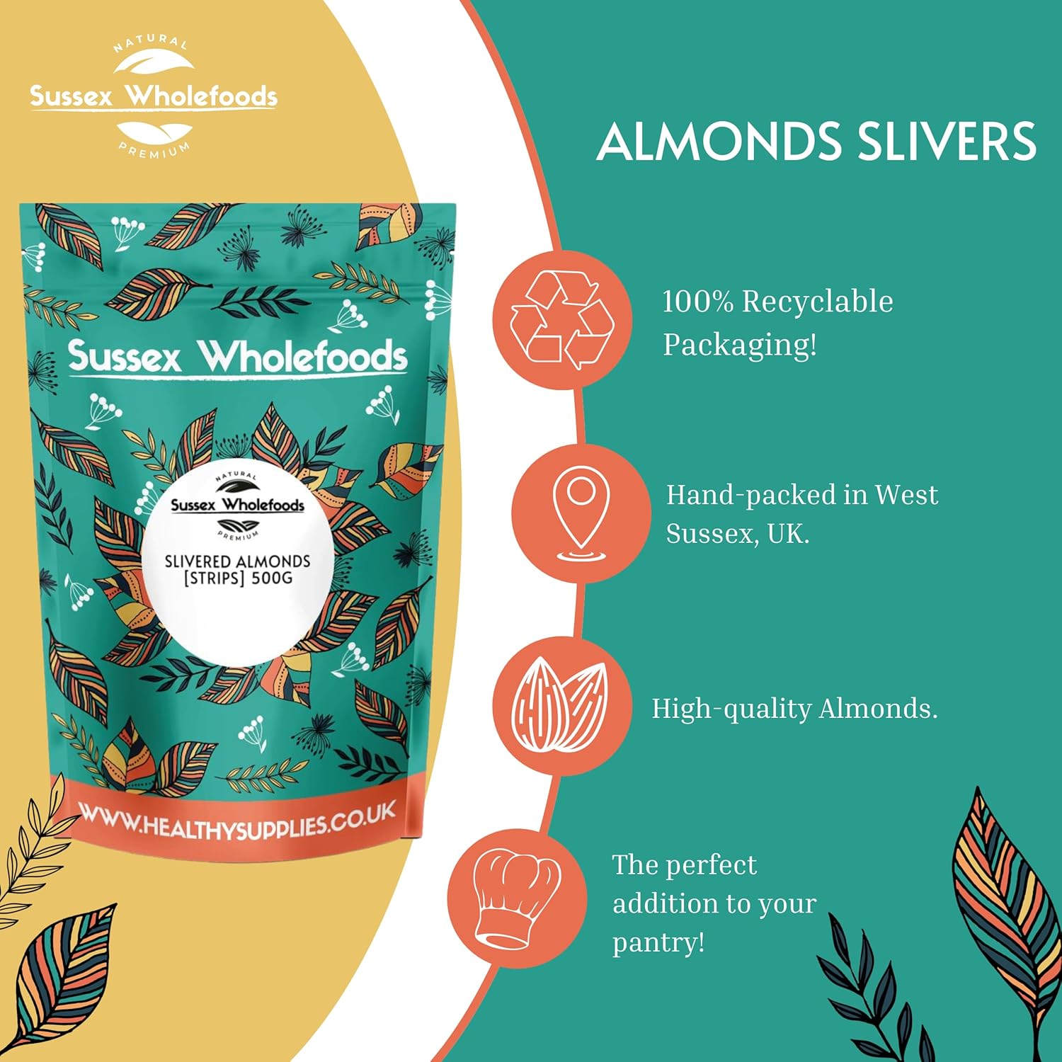 Product description Almonds Slivers [Strips] 250g (Healthy Supplies). Slivers of Blanched Almond Ready-to-eat long slices of Almond. Un-roasted, no added salt or sugar. Garnish for cakes, biscuits, pastries and desserts. Adds a nutty bite to muesli, granola and porridge. Can be gently toasted in the oven when needed. These strips or 'slivers' of almonds are made from blanched almonds that are sliced lengthwise. They provide a lovely bite to a recipe than say the more commonly used flaked almond. Almond slivers are frequently used to garnish sweet recipes such as cookies, French patisserie and tea loaves. They are a great alternative to the full sized almond in breakfast porridge and muesli. The the strips of almond are equally tasty when sprinkled into cooked green vegetables (French Beans), green salads, pasta salad or cous cous. The almond pieces can also be lightly toasted under the grill/in an oven or gently dry roasted in a non-stick frying pan. You might also like... Chopped Almonds 500g (Sussex Wholefoods) Chopped almonds - medium-fine for use in confectionery, desserts and granola. Ingredients: Blanched Almonds. Produce of USA. For more information on our ingredients policy please see here Nutritional Information Typical Values Per 100g Energy 612 calories Protein 21. 1g Carbohydrates 6. 9g of which sugars 4. 2g Fat 55. 8g of which saturates 4. 7g Fibre 7. 4g Sodium Trace Ingredients Blanched Almonds,Ready-to-eat long slices of Almond,Un-roasted, no added salt or sugar,Garnish for cakes, biscuits, pastries and desserts,Adds a nutty bite to muesli, granola and porridge,Can be gently toasted in the oven when needed
