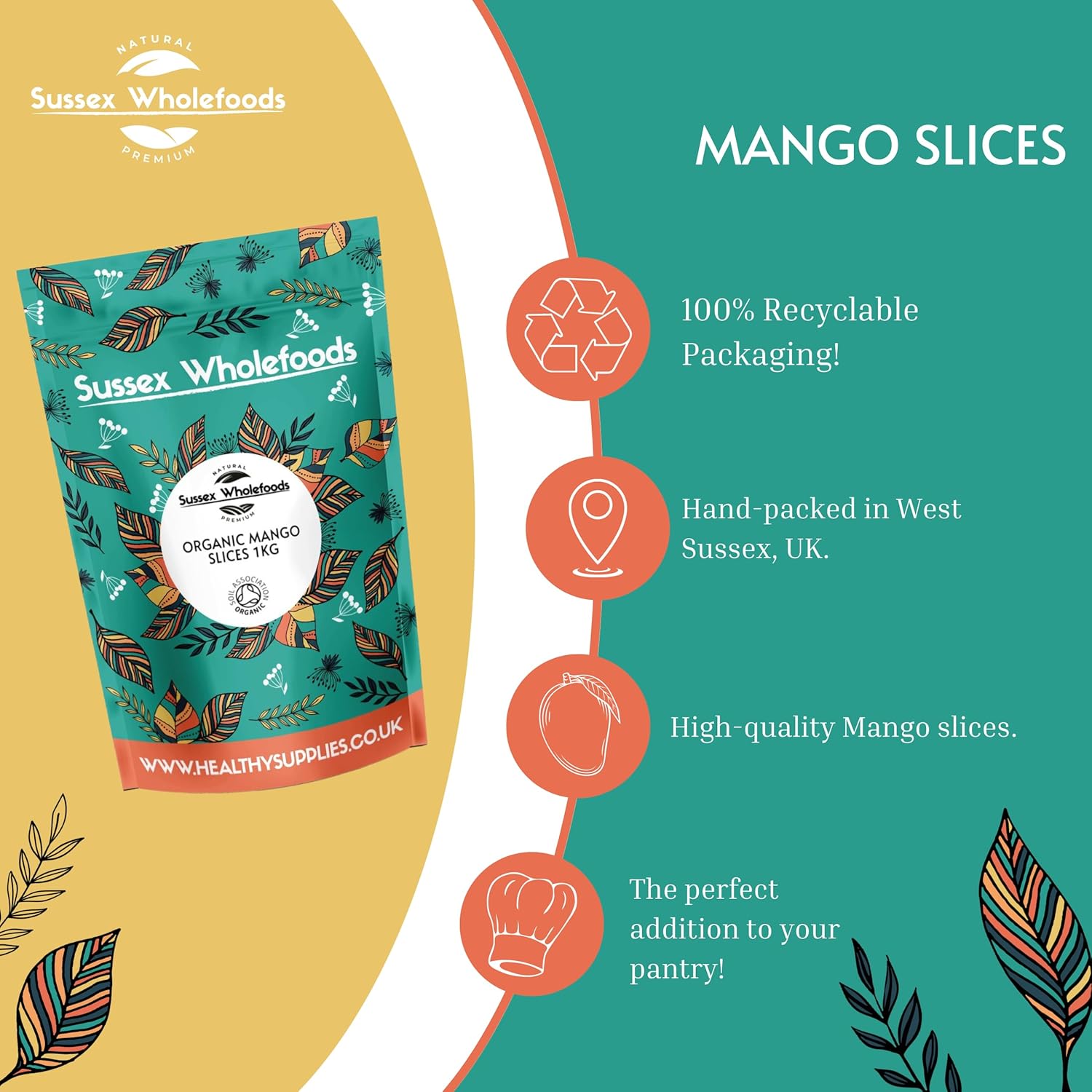 Product description Experience the tropical delight of Sussex Wholefoods Organic Mango Slices, your go-to snack for a burst of natural sweetness. Our premium organic mango slices are carefully selected and dried to perfection, preserving their juicy flavour and rich, vibrant colour. Perfect for a healthy snack, these slices offer a taste of the tropics in every bite. Ideal for those who seek nutritious and delicious snacking options, these mango slices are free from additives and preservatives, ensuring you enjoy only the pure, natural goodness of organic fruit. Whether you're on the go or looking to enhance your recipes, our dried mango is versatile and convenient. Add them to your morning cereal, bake them into your favourite treats, or simply enjoy them straight from the bag. Packed with essential vitamins and minerals, Sussex Wholefoods Organic Mango Slices are more than just a tasty treat - they're a health boost in every bite. The last batch packed at our facility in Sussex, UK has the following specifications: - Date produced: Tue 20 May 2025 14:38 - Batch no.: 142482 - Best before: End Jan 2026 - Country of origin: Burkina Faso - Organic produce: Yes Ingredients Organic Mango, sliced P.when('A').execute(function(A) { A.on('a:expander:toggle_description:toggle:collapse', function(data) { window.scroll(0, data.expander.$expander[0].offsetTop-100); }); }); Safety Warning Packed in a factory that also handles nuts, soya, sesame, eggs, milk, mustard, celery, wheat and gluten. See more,Pure mango bliss - just natural sweetness in every bite!,Healthy snack hack - tropical flavor, zero added sugar!,Sun-kissed organic mangoes - ripe, juicy, and ready to eat!,Mess-free mango - perfect snack, no peeling required!,Naturally sweet - no syrups or artificial flavors!,Energize with a bite - perfect fuel for your busy days!,Versatile treat - snack, blend, or top your favorite foods!,Chewy goodness - tropical sweetness in every slice!,Stay fuller longer - fiber-packed mango magic!,Low-calorie delight - guilt-free, tasty, and healthy!