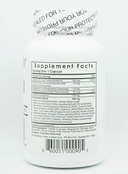 Ingredients: Vitamin B12 (As Cyanocobalamin) 60 Mcg (2500Percent Daily Value) Chromium ( As Chromium Polynicotinate) 50 Mcg (143Percent Daily Value) Caffeine Anhydrous 100 Mg ( Dv Not Established) Proprietary Blend 640.5 Mg ( Dv Not Established): Ginkgo Leaf, Phenylethylamine, Cola Nut Seed, Eleuthero (Siberian Ginseng) Root, Green Tea Leaf Extract, White Willow Bark, Fo-Ti Root, Guarana Seed Extract, Yerba Mate Leaf, Bee Pollen, Ginger Root, Asian Ginseng Root, American Ginseng Root, Bitter Orange Fruit Other Ingredients: Gelatin (Capsule), Microcrystalline Cellulose, Magnesium Stearate, Titanium Dioxide, Fd&C Red #3, Fd&C Blue #1 Contains: Tree Nuts (Cola Nut)