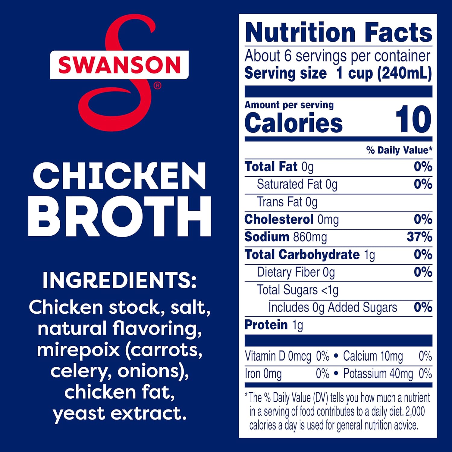 Elevate your homemade meals with the rich, full-bodied flavor of SwansonÂź Chicken Broth. SwansonÂź chicken broth brings together the perfectly balanced flavors of farm-raised chicken, vegetables picked at the peak of freshness and high-quality seasonings in a convenient recyclable carton. And just like homemade, our broth uses only 100% natural, non-GMO ingredients, with no artificial flavors or colors, and no preservatives. More convenient than chicken bouillon, this gluten free chicken broth is a versatile ingredient for your everyday cooking, adding flavor and moisture to both entrees and side dishes. Itâs great as a soup base, and it can be used instead of water to boost rich flavor in rice, pasta and veggies. SwansonÂź Chicken Broth is a must-have for your holiday cooking, bringing richer, elevated homemade flavor to mashed potatoes, stuffing and more. Itâs not just any broth. Itâs SwansonÂź