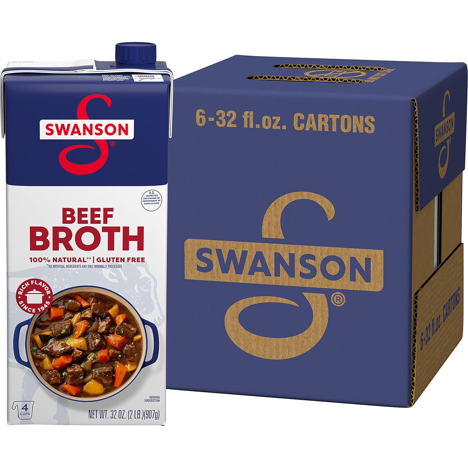 Elevate your homemade meals with the rich roasted flavor of Swanson Beef Broth. Swansonâs beef broth brings together the perfectly balanced flavors of roasted beef and vegetables picked at the peak of freshness in a convenient recyclable carton. And just like homemade, our broth uses only 100% natural (1), non-GMO ingredients, with no MSG added (2), no artificial flavors or colors, and no preservatives. More convenient than beef bouillon, this fat-free, gluten-free beef broth is a versatile ingredient for your everyday cooking, adding flavor and moisture to both entrees and side dishes. Itâs great as a stew or soup base, and it can be used instead of water to boost rich flavor in rice, pasta and veggies. Swanson Beef Broth is a must-have for your holiday cooking, bringing richer, elevated homemade flavor to beef-centered recipes such as pot roast, brisket and more. Itâs not just any broth. Itâs Swanson. In addition to beef broth, Swanson offers a variety of other delicious broths, including Chicken and Vegetable. Try Swanson Beef Stock for even richer flavor and a heavier texture. (1) No artificial ingredients and only minimally processed (2) Except for the small amount naturally occurring in yeast extract