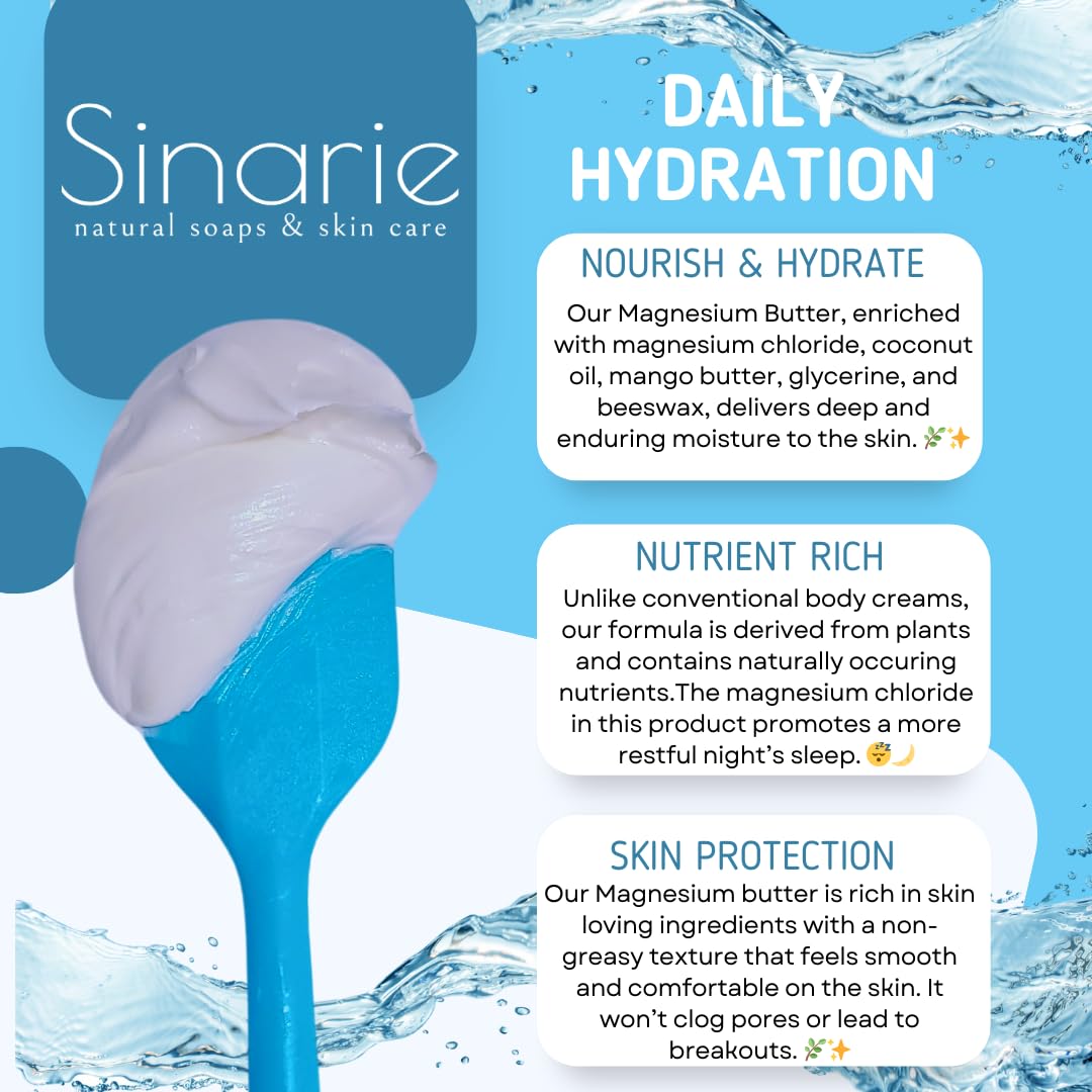 About this item Hydrating Delight: Our Magnesium Butter, enriched with coconut oil, mango butter, glycerin, and beeswax, delivers deep and enduring moisture to the skin.  Our Magnesium Butter provides essential nutrients that rejuvenate the skin.  The magnesium chloride in this product promotes a more restful nightâs sleep.  Quick Absorption: Our Magnesium Butter effortlessly seeps into the skin, leaving no greasy or sticky residue.  Light and Comfortable: Our product features a non-greasy texture that feels smooth and comfortable on the skin. It wonât clog pores or lead to breakouts.   See more product details,Hydrating Delight: Our Magnesium Butter, enriched with coconut oil, mango butter, glycerin, and beeswax, delivers deep and enduring moisture to the skin. ,Our Magnesium Butter provides essential nutrients that rejuvenate the skin. ,The magnesium chloride in this product promotes a more restful nightâs sleep. ,Quick Absorption: Our Magnesium Butter effortlessly seeps into the skin, leaving no greasy or sticky residue. ,Light and Comfortable: Our product features a non-greasy texture that feels smooth and comfortable on the skin. It wonât clog pores or lead to breakouts.