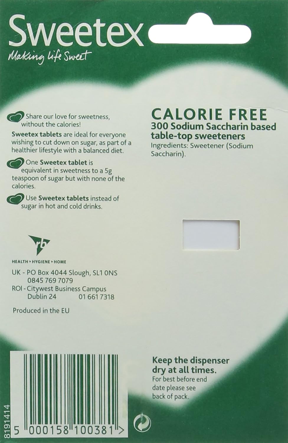 Product Description 1 x sweetex tablet is equivalent in sweetness to a 5 g teaspoon of sugar Ingredients Sweetener (Sodium Saccharin), Anticaking Agents (Silicon Dioxide, Magnesium Stearate). P.when('A').execute(function(A) { A.on('a:expander:toggle_description:toggle:collapse', function(data) { window.scroll(0, data.expander.$expander[0].offsetTop-100); }); }); Directions Directions for Use: 1. Open the Sweetex Dispenser by pressing the release button or sliding the cover. 2. Remove one Sweetex tablet from the dispenser. 3. Place the tablet in your beverage or recipe that requires sweetening. 4. Stir or mix the beverage or recipe to ensure the Sweetex tablet dissolves completely. 5. Adjust the number of Sweetex tablets used according to your taste preferences. 6. Close the Sweetex Dispenser securely to prevent moisture from entering and affecting the remaining tablets. 7. Store the Sweetex Dispenser in a cool, dry place away from direct sunlight. 8. Keep the dispenser out of reach of children. 9. Dispose of the Sweetex Dispenser responsibly once all tablets have been used. 10. Enjoy the sweetness of Sweetex without the calories in your favorite beverages and recipes. Safety Warning Keep the Sweetex dispenser dry at all times. Box Contains 1 x Sweetex Calorie Free Sweeteners 300 Tablets See more,Contains 300 sweetex tablets,Ideal for everyone wishing to cut down on sugar,Calorie free,1 x sweetex tablet is equivalent in sweetness to a 5 g teaspoon of sugar