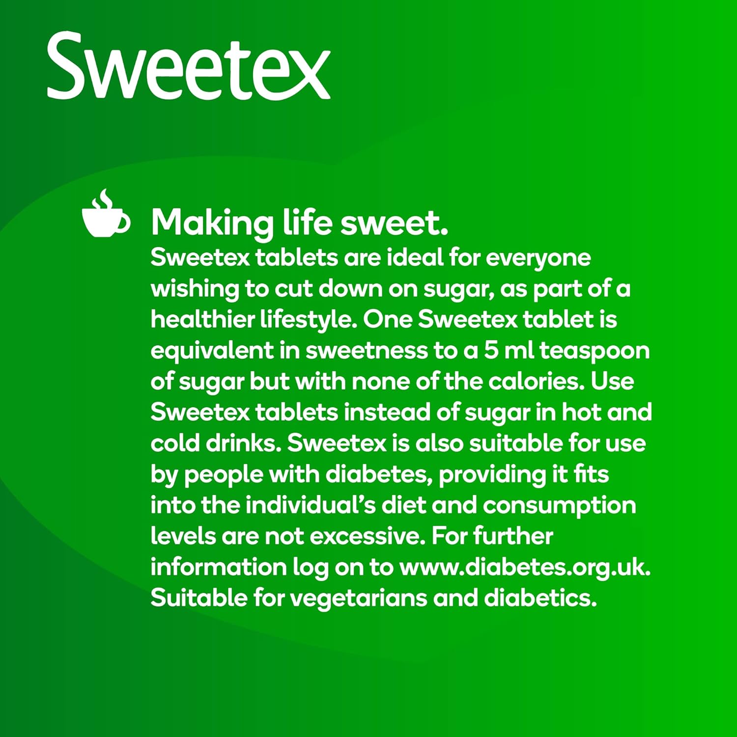 Product Description Sweetex tablets are ideal for everyone wishing to cut down on sugar, as part of a healthier lifestyle. One Sweetex tablet is equivalent in sweetness to a 5 ml teaspoon of sugar but with none of the calories. Use Sweetex tablets instead of sugar in hot and cold drinks. Sweetex is also suitable for use by people with diabetes, providing it fits into the individual's diet and consumption levels are not excessive. For further information log on to www. diabetes.org.uk. Suitable for vegetarians and diabetics. Always read the label RKT-M-07396. Indications Sweetener (Sodium Saccharin), Anticaking Agents (Silicon Dioxide, Magnesium Stearate). P.when('A').execute(function(A) { A.on('a:expander:toggle_description:toggle:collapse', function(data) { window.scroll(0, data.expander.$expander[0].offsetTop-100); }); }); Ingredients Sweetener (Sodium Saccharin), Anticaking Agents (Silicon Dioxide, Magnesium Stearate). Safety Warning Always read the label Box Contains Each order comes with 6 x Sweetex 600 Tablets Manufacturer Contact Information More Information on Package See more,WHY SWEETEX Used by many people as a healthier alternative to sugar (sucrose), Sweetex tablets are ideal for people wishing to cut their sugar intake, as part of a healthier lifestyle, without missing out on the sweet taste,ZERO SUGAR AND CALORIES - One Sweetex tablet is equivalent in sweetness to a 5 ml teaspoon of sugar but with none of the calories,HOT AND COLD - Use Sweetex tablets instead of sugar in hot and cold drinks,DIABETES FRIENDLY - Sweetex is also suitable for use by people with diabetes, providing it fits into the individual's diet and consumption levels are not excessive,POCKET FRIENDLY DISPENSER β perfect sugar alternative for every drink on the go