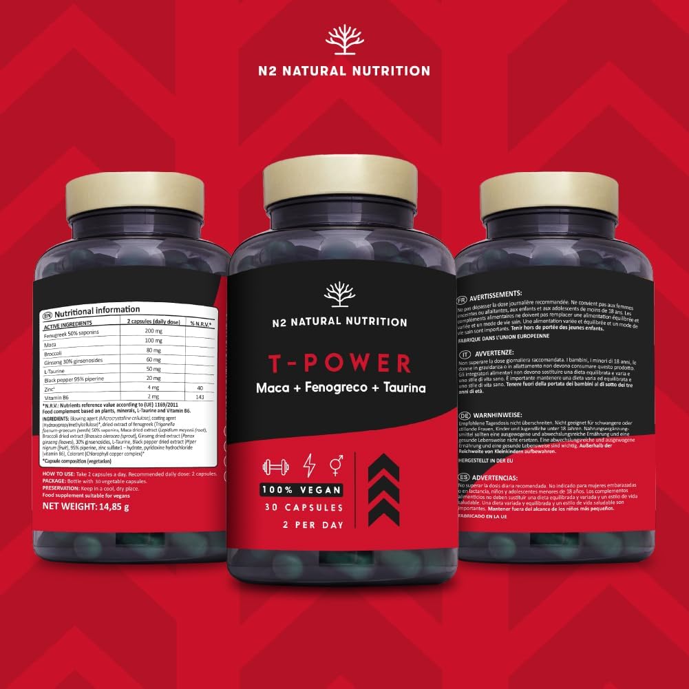 T-Power Natural Supplements For Men. Maca Root, Zinc, Gingseng, Fenugreek, L-Taurine, Black Pepper. Mood Stimulant + Endurance + Energy. Pre Workout. 30 Capsules. Vegan. N2 Natural Nutrition