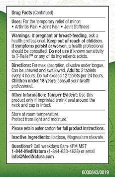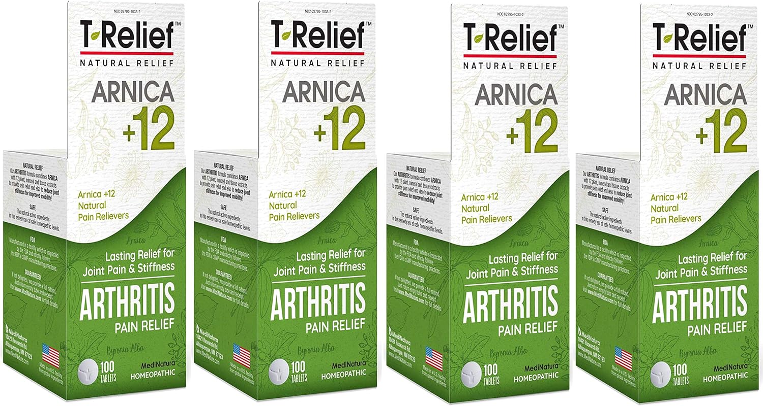 DESCRIPTION : T-Relief Arthritis Arnica +12 Natural Medicines for Soreness Stiffness Aches & Pains in Joints - 100 Tablets (4 Pack)100 Count (Pack of 4)