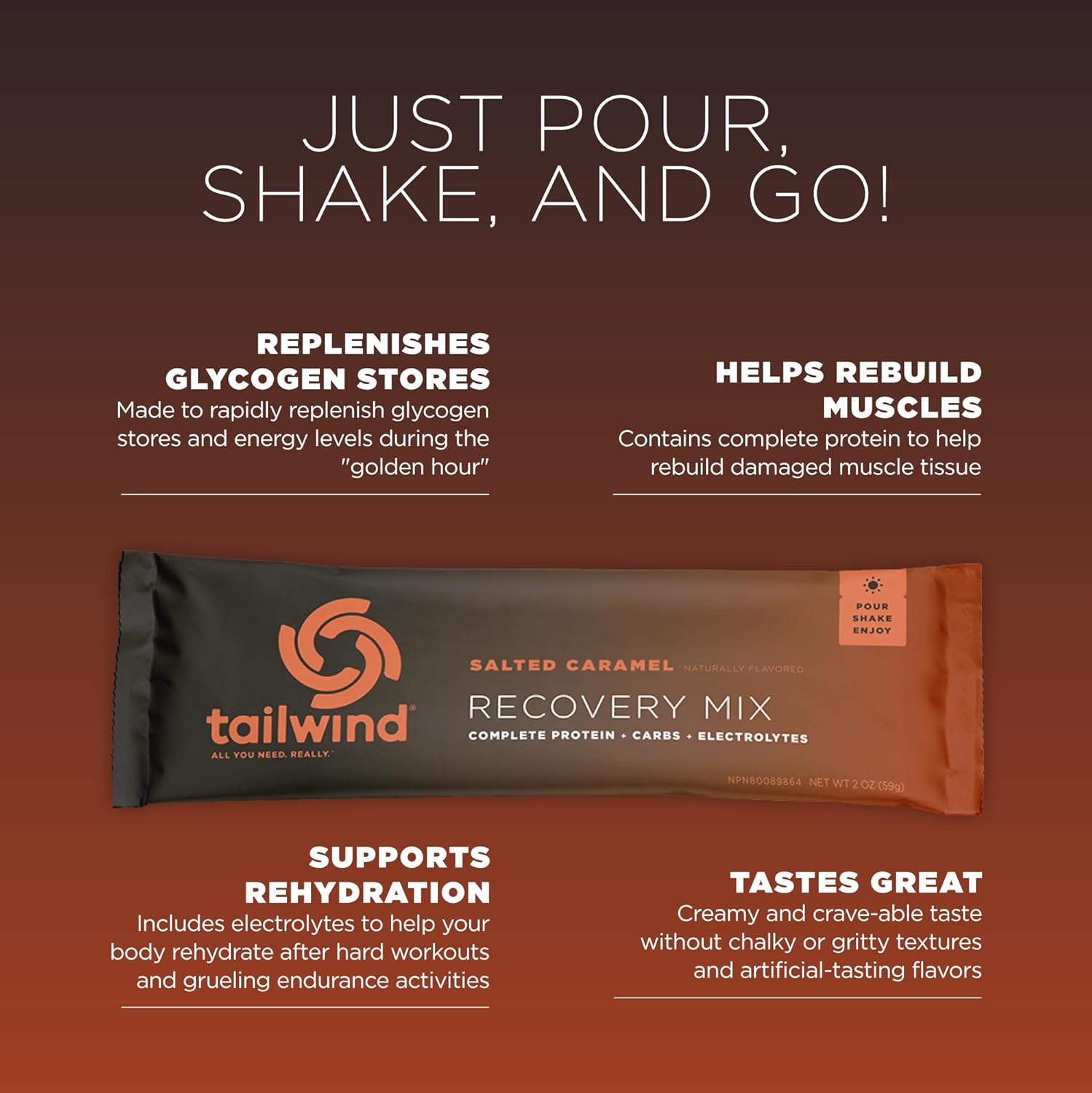 Tailwind Nutrition Recovery Mix, Complete Protein, Carbohydrates, And Electrolytes Powder Drink Mix For Post-Workout, Free Of Gluten, Soy, And Dairy, Vegan, 12 Servings, Salted Caramel