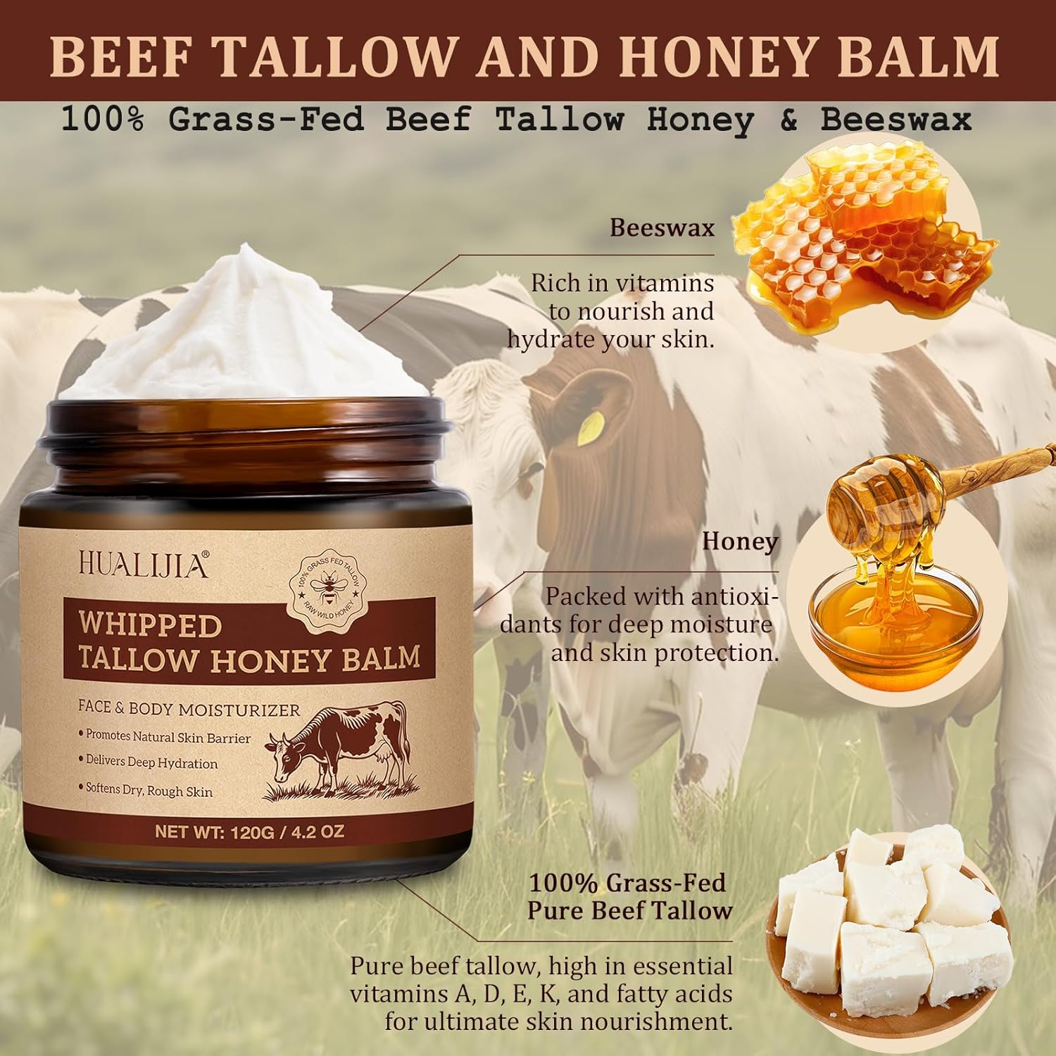 Tallow And Honey Balm (120G), Beef Tallow For Skin, Tallow Face Moisturizer, Organic Grass Fed Whipped Beef Tallow Cream, Deeply Hydrates And Moisturizes Face Body, Fast Absorption, Glass Bottle
