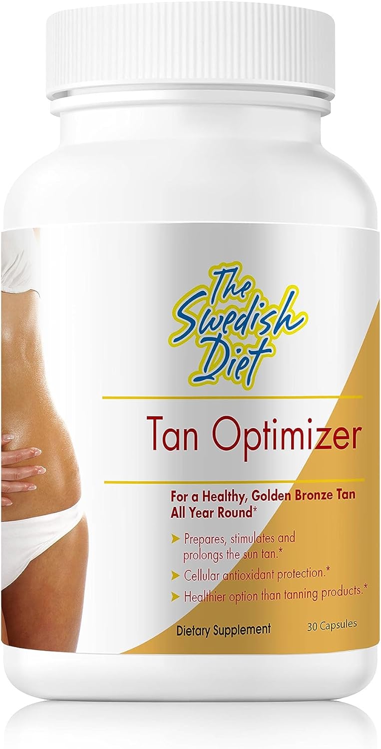 The Swedish Diet tan Optimizer is great for a healthy, golden bronze tan all year round. This unique supplement includes 25, 000 IU of vitamin A as beta carotene, Vitamin C, Vitamin E, Vitamin B2 and B3, zinc, Selenium, copper and Lycopene. These are great natural antioxidant defenses against free radicals and good for the Immune System
