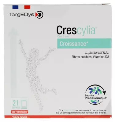 Targedys Crescylia Growth 21 Sachets Is A Dietary Supplement For Children Aged 3 And Over. It Combines The Lactiplantibacillus Plantarum Wjl Strain And Vitamin D3 To Support Normal Growth And Bone Development In Children. A Formula Specially Developed For Children, With No Major Allergens, No Nanoparticles And The Great Taste Of Red Fruit. Made In France
