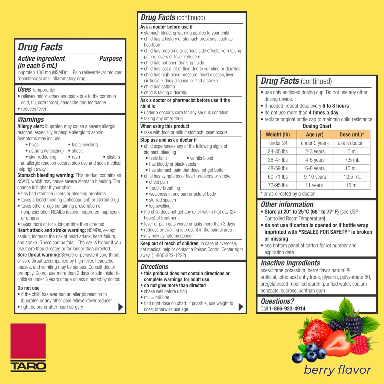 About this item Children's Ibuprofen: Taro Ibuprofen Oral Suspension (100 mg per 5 ml) is a nonsteroidal anti-inflammatory drug (NSAID) that helps to lower high temperature & ease discomfort. Suitable for children ages 2-11 years Long-Lasting Relief: Our kids Ibuprofen helps temporarily reduce fever and relieve minor aches and pains due to the common cold, sore throat, headaches and toothaches. Delivers up to 8 hours of relief Dye-Free & Non-Staining: Our children's ibuprofen liquid comes in a delicious berry flavor, making it an easier medicine for kids to take. This kids fever reducer is a dye free ibuprofen Convenient Dosage Instructions: Refer to the dosing chart (on the packaging) for administering the correct dose. If needed, repeat every 6-8 hours. Do not use more than 4 times a day. Use only the enclosed dosing cap Effective Healthcare Solutions: Taro Pharma provides effective medications for a range of health needs. Our dedication to high standards of healthcare helps promote a healthier lifestyle for the whole family See more product details,Children's Ibuprofen: Taro Ibuprofen Oral Suspension (100 mg per 5 ml) is a nonsteroidal anti-inflammatory drug (NSAID) that helps to lower high temperature & ease discomfort. Suitable for children ages 2-11 years,Long-Lasting Relief: Our kids Ibuprofen helps temporarily reduce fever and relieve minor aches and pains due to the common cold, sore throat, headaches and toothaches. Delivers up to 8 hours of relief,Dye-Free & Non-Staining: Our children's ibuprofen liquid comes in a delicious berry flavor, making it an easier medicine for kids to take. This kids fever reducer is a dye free ibuprofen,Convenient Dosage Instructions: Refer to the dosing chart (on the packaging) for administering the correct dose. If needed, repeat every 6-8 hours. Do not use more than 4 times a day. Use only the enclosed dosing cap,Effective Healthcare Solutions: Taro Pharma provides effective medications for a range of health needs. Our dedication to high standards of healthcare helps promote a healthier lifestyle for the whole family