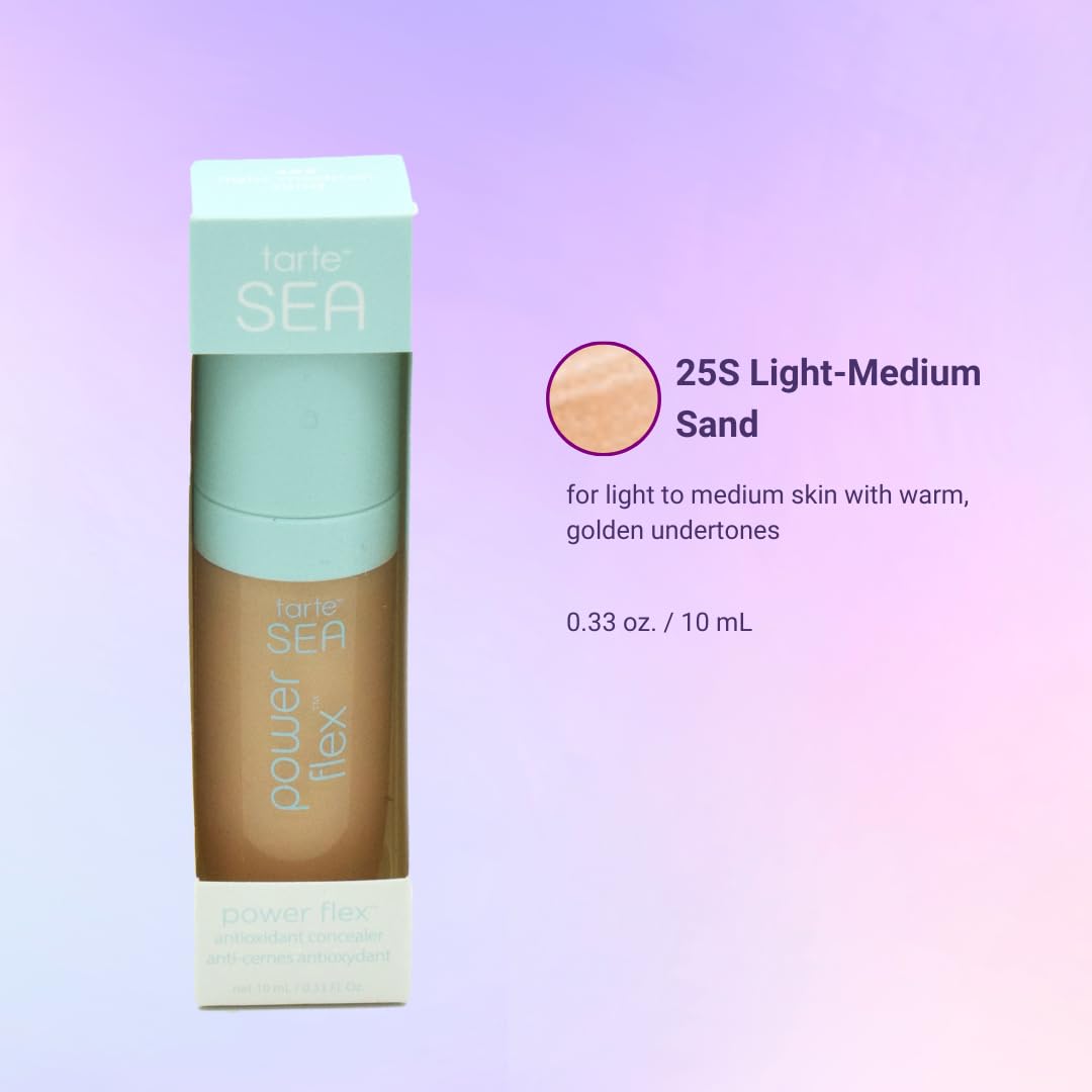 TARTE SEA Power Flex Full Coverage Vegan Concealer Color: 25S Light-Medium Sand - light to medium skin with warm, golden undertones Size 0.33 oz. / 10 mL A skincare-powered, smoothing & brightening full-coverage concealer that delivers 24-hr hydration & moves with your skin so it won't cake or crease. Key Ingredients: - Hyaluronic Acid: Delivers moisture, visible firmness, and suppleness. - Niacinamide: A soothing ingredient that helps reduce the look of fine lines and dullness. - Marine Plants: Help reduce the look of fine lines and wrinkles while smoothing and softening. How to Use: -Swipe a pea-sized amount of the formula directly onto the under-eyes using the plush applicator. -Apply to dark spots, redness, and blemishes. -Blend out with the powerflex brush (sold separately) or fingers. -Pair with hydro flex serum foundation (sold separately) for a flawless full face