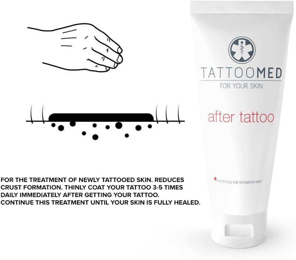 Product Description TattooMed after tattoo is for the treatment of fresh tattooed skin, from the first day. Thanks to the specially developed formula, with an extra high concentration of Panthenol and Vitamin E, the cream penetrates deep into the skin, protects the tattoo and supports rapid wound healing, resulting in a beautiful Tattoo. Fast wound repair reduces the risk of inflammation. Ingredients Panthenol 7%, Vitamin E P.when('A').execute(function(A) { A.on('a:expander:toggle_description:toggle:collapse', function(data) { window.scroll(0, data.expander.$expander[0].offsetTop-100); }); }); Safety Warning For external use only, avoid eye contact See more,TattooMed After Tattoo spreads easily, does not give grease stains and does not contaminate the clothing,Intensive tattoo care, reduces itching,Moisturizes optimal care,protects the colours softens the skin,with Panthenol (7%) with vitamin E