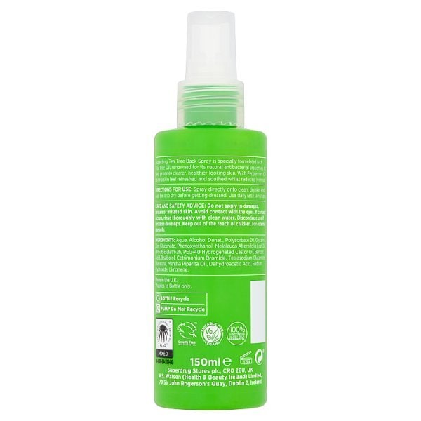 Product Information:This Tea Tree Back Spray Is Formulated With Tea Tree Oil, To Help Promote Clearer, Healthier-Looking Skin. The Peppermint Oils Also Helps Skin Feeling Refreshed And Prevents Breakouts,Warning Or Restrictions:Do Not Apply To Damaged, Broken Or Irritated Skin. Avoid Contact With The Eyes. If Contact Occurs, Rinse Thoroughly With Clean Water. Discontinue Use If Irritation Develops. Keep Out Of The Reach Of Children. For External Use Only,Product Specification:Aqua, Alcohol Denat., Polysorbate 20, Glycerin, Zinc Gluconate, Phenoxyethanol, Melaleuca Alternifolia Leaf Oil, Ppg-26-Buteth-26, Peg-40 Hydrogenated Castor Oil, Benzoic Acid, Bisabolol, Cetrimonium Bromide, Tetrasodium Glutamate Diacetate, Mentha Piperita Oil, Dehydroacetic Acid, Sodium Hydroxide, Limonene,Product Uses:Spray Directly Onto Clean, Dry Skin And Wait For It To Dry Before Getting Dressed. Use Daily Until Skin Clears,Recyclable:Bottle- Recycle, Pump โ Do Not Recycle