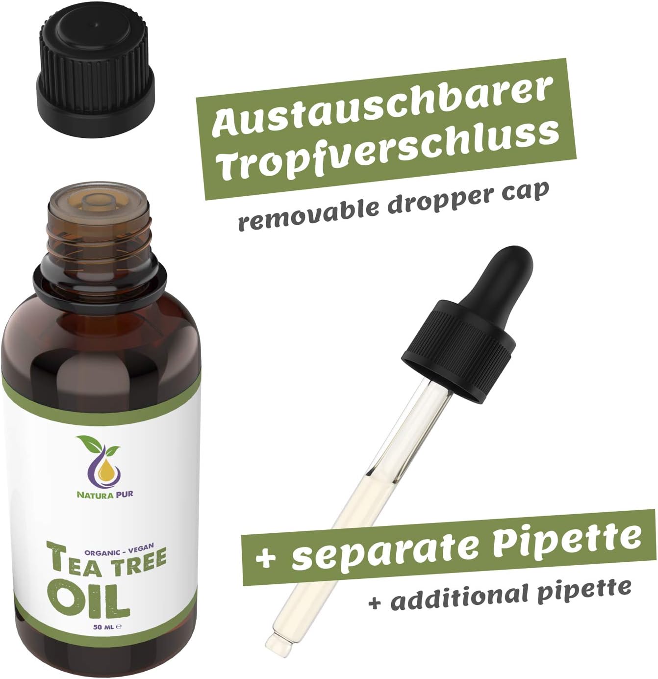 Natura Pur Tea Tree Oil 50ml - 100% organic & natural essential oil from Australia, vegan Tea tree oil is extracted from the leaves of the Australian tea tree. The healing power of this wonderful oil was already known to the aborigines of Australia. They crushed tea tree leaves to make bandages or placed crushed leaves on hot stones to inhale the evaporating oil. Today, tea tree oil is extracted by gentle steam distillation, but the range of uses is wider than ever before. Health, household, body care: its universal mode of action makes tea tree oil the natural all-rounder of our time! How does tea tree oil help Tea tree oil has a disinfecting, anti-inflammatory and wound-healing effect. NATURA PUR Organic Tea Tree Oil 50ml Pure skin with the best natural ingredients The skin is our largest organ. It protects our body from adverse weather conditions and stands for a youthful appearance. Always provided that we give it the necessary attention and care. Do you also know the feeling of a too brittle and dry skin, on which skin impurities can also appear Our natural tea tree oil helps you to effectively improve your skin's appearance. For clear skin and youthful radiance. 100% pure organic tea tree oil (Melaleuca Alternifolia), nothing else Maximum effect - ideal for the care of skin problems Best natural cosmetics without additives Free from chemicals, parabens, pesticides, etc. Free from animal testing and 100% vegan,?? THE BEST FOR YOUR BEAUTY: Ideal for the care of skin problems such as pimples or blackheads thanks to its natural anti-inflammatory, antiseptic effect,?? AROMA THERAPY: Suitable as fragrance for massage and diffuser, for decreasing stress and anxiety as well as support against bad breath, foot odor, sweaty feet, dandruff or itchy scalp,?? HIGHEST POSSIBLE QUALITY: 100% Australian undiluted tea tree oil (Melaleuca Alternifolia), obtained through the gentle process of water distillation of the very best tea tree leaves, pure, vegan and animal cruelty free,?? HIGH QUALITY PACKAGING: Tinted glass bottle provides protection from light and guarantees long shelf life. Easy dosage via the integrated drip attachment or, alternatively, via the enclosed pipette. The tee tea oil comes in lovely packaging – ideally suited as a gift,?? 100% SATISFACTION: Your satisfaction is our motivation! We want you to be convinced of our high-quality natural cosmetics and to achieve long-lasting results. Should that not be the case, we’ll gladly refund your money, no questions asked