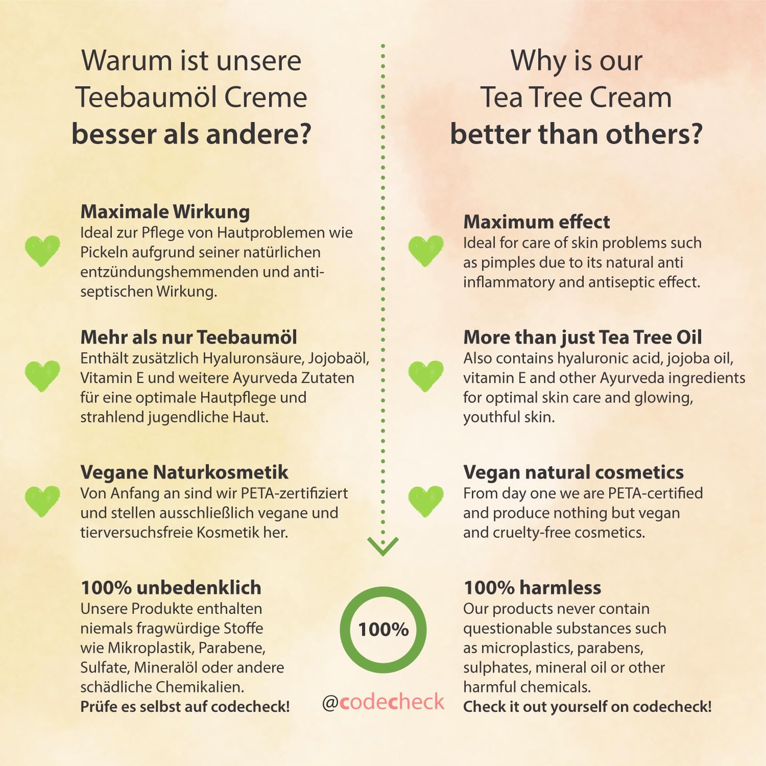About this item ?? THE BEST FOR YOUR BEAUTY: Ideal for the care of skin problems such as pimples or blackheads due to its natural anti-inflammatory and antiseptic effect. ?? MAXIMUM EFFECT: High percentage of pure tea tree oil (Melaleuca Alternifolia), gently obtained from Australian tea tree leaves through steam distillation. ?? WELLNESS FOR YOUR SKIN: Nourishing jojoba oil, hyaluronic acid, vitamin E and well-known Ayurvedic ingredients such as skullcap, white willow and neem ensure radiant and youthful skin. ?? 100% SATISFACTION: Your satisfaction is our motivation! We want you to be convinced of our high-quality natural cosmetics and to achieve long-lasting results. Should that not be the case, we’ll gladly refund your money, no questions asked. ?? 100% SATISFACTION: Your satisfaction is our motivation! We want you to be convinced of our high-quality natural cosmetics and to achieve long-lasting results. Should that not be the case, we’ll gladly refund your money, no questions asked. › See more product details,?? THE BEST FOR YOUR BEAUTY: Ideal for the care of skin problems such as pimples or blackheads due to its natural anti-inflammatory and antiseptic effect,?? MAXIMUM EFFECT: High percentage of pure tea tree oil (Melaleuca Alternifolia), gently obtained from Australian tea tree leaves through steam distillation,?? WELLNESS FOR YOUR SKIN: Nourishing jojoba oil, hyaluronic acid, vitamin E and well-known Ayurvedic ingredients such as skullcap, white willow and neem ensure radiant and youthful skin,?? 100% SATISFACTION: Your satisfaction is our motivation! We want you to be convinced of our high-quality natural cosmetics and to achieve long-lasting results. Should that not be the case, we’ll gladly refund your money, no questions asked,?? 100% SATISFACTION: Your satisfaction is our motivation! We want you to be convinced of our high-quality natural cosmetics and to achieve long-lasting results. Should that not be the case, we’ll gladly refund your money, no questions asked