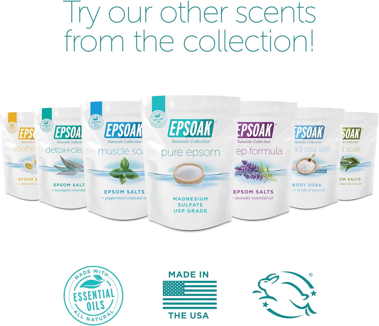 Made With Epsoak Epsom Salt & Minera Dead Sea Salt - Trusted Brands Of Sfsc. Proudly Made In The Usa. Never Tested On Animals, Leaping Bunny Certified Cruelty Free