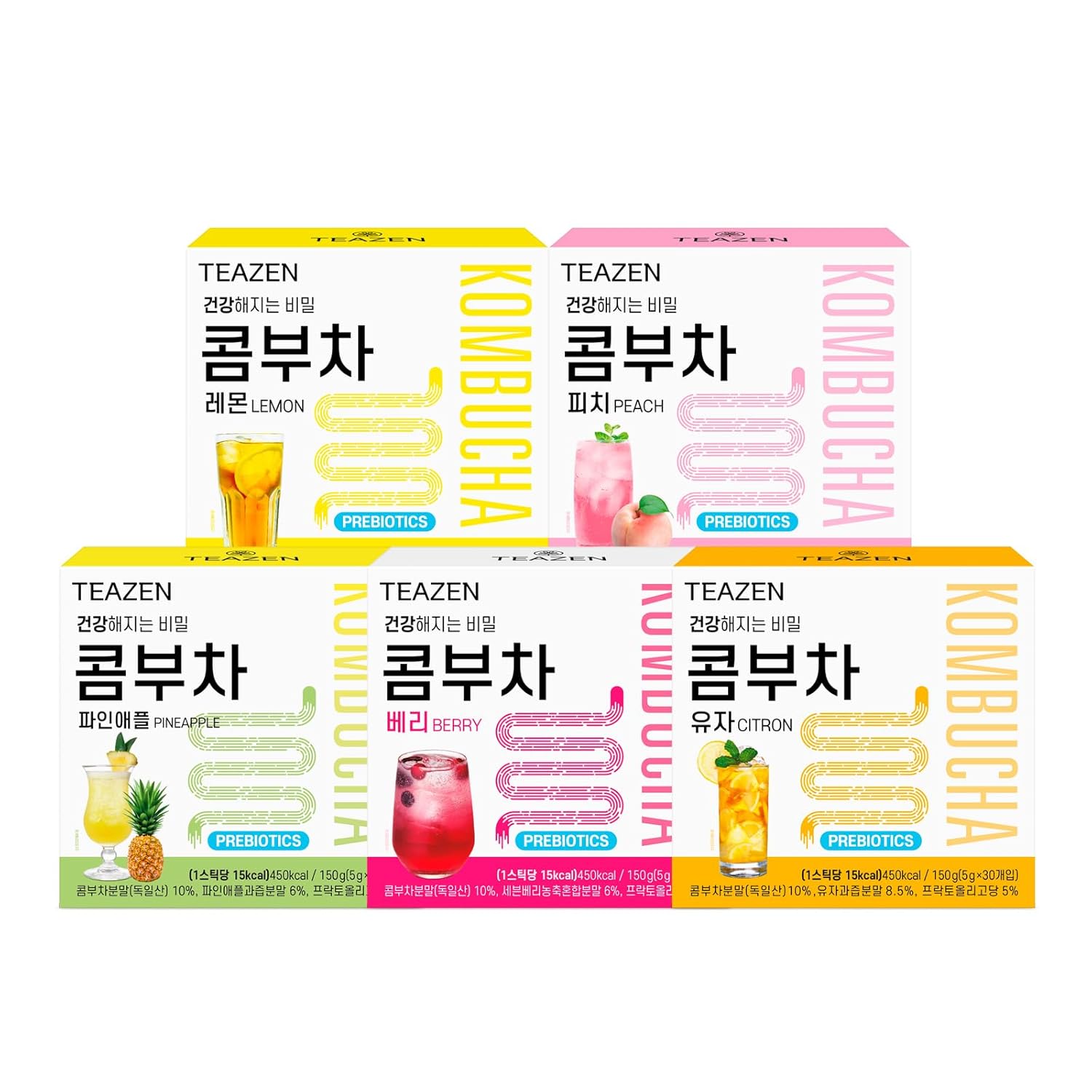 Teazen Kombucha 5 Flavors 150 Sticks Variety Pack, Kombucha Lemon, Peach, Berry, Pineapple, Citron Flavor (150 Sticks)