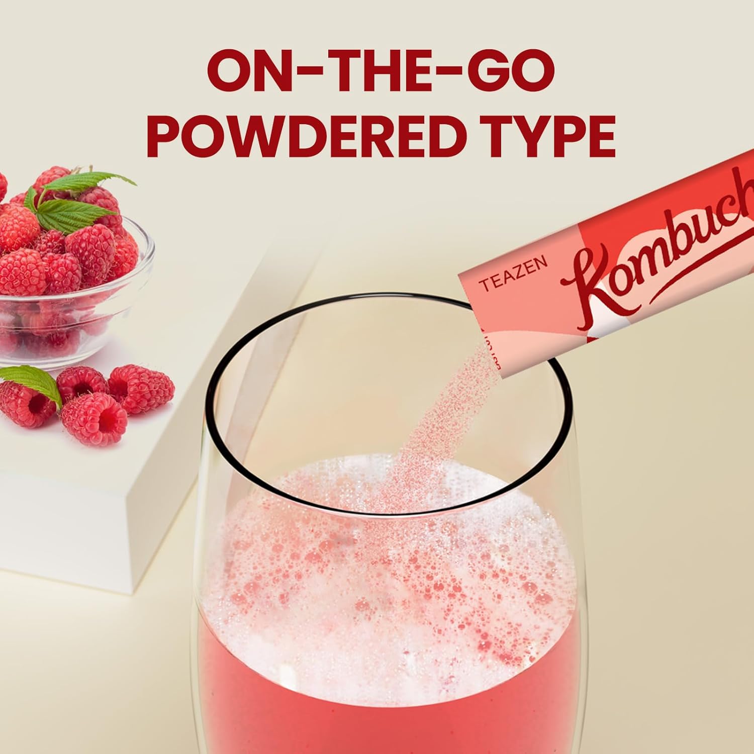Teazen Kombucha Tea, Zero Sugar, Sparkling Fermented Powdered Mix Beverage From Korea, Live Probiotics & Prebiotics (Raspberry)