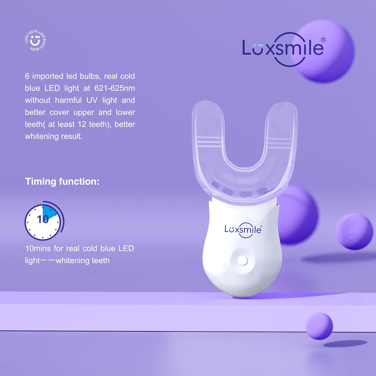 Professional Teeth Whitening Kit- Luxsmile home teeth whitening light kit adopts 6 powerful LED bulbs to help accelerate our teeth whitener gel to break-up and dissolve stubborn stains caused by food, wine, smoking and aging. The rechargeable teeth whitening light is ready for long time use to help with your teeth whitening time