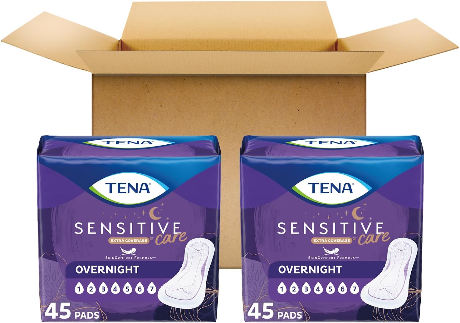 SKINCOMFORT FORMULA: To help protect sensitive, intimate skin (Skin Friendly Layer + 100% breathable + soft materials)NIGHT TIME USE: Locks in liquid while you sleep. For worry free nightsTRIPLE PROTECTION: Protects against bladder leaks, urine odor and wetness20% MORE COVERAGE: To provide additional security and leak protection compared to our TENA Ultimate padsDERMATOLOGICALLY APPROVED: By the Skin Health AllianceTENA, trusted by millions of women worldwide, continues to keep your intimate skin a priority. TENA Sensitive Care Extra Coverage Overnight Incontinence Pads with lie down protection and 20% extra coverage* are now the first ever bladder weakness pads enriched with our SkinComfort Formula. Our skin friendly layer in combination with our soft and 100% breathable materials, help protect intimate skin. Our triple protection against bladder leaks odor and wetness, Duolock core, and cushiony foam side barriers offer skin comfort and security. TENA Sensitive Care Extra Coverage Overnight pads are for worry free nights, designed for overnight use and for women experiencing post-partum incontinence. *compared to our TENA Ultimate pads