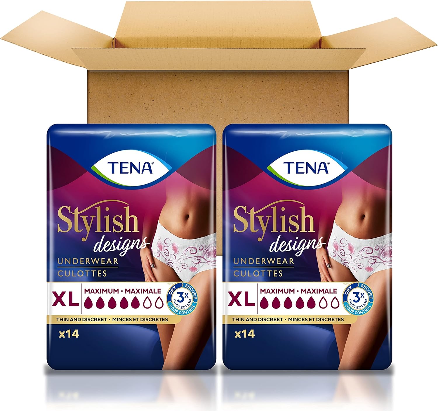 JUST LIKE UNDERWEAR: Available in sleek black and a stylish white printed designBODY HUGGING FIT: With a soft and stretchable waistbandSOFT AND GENTLE ON SKIN: Made with cottony-soft stretch fabricTRIPLE PROTECTION: Triple protection against urine leaks, urine odor and wetnessSUPER ABSORBENT CORE: Designed for Maximum absorbency to lock in liquidFeaturing cottony-soft fabric, our Tena Stylish Incontinence Underwear for women is designed to look and feel just like regular underwear. Offering triple protection against bladder leaks, urine odor, and wetness, our form-fitting underwear is made for women with significant bladder leakage situations. Available in sleek black or our stylish white printed design (print pattern may vary slightly)