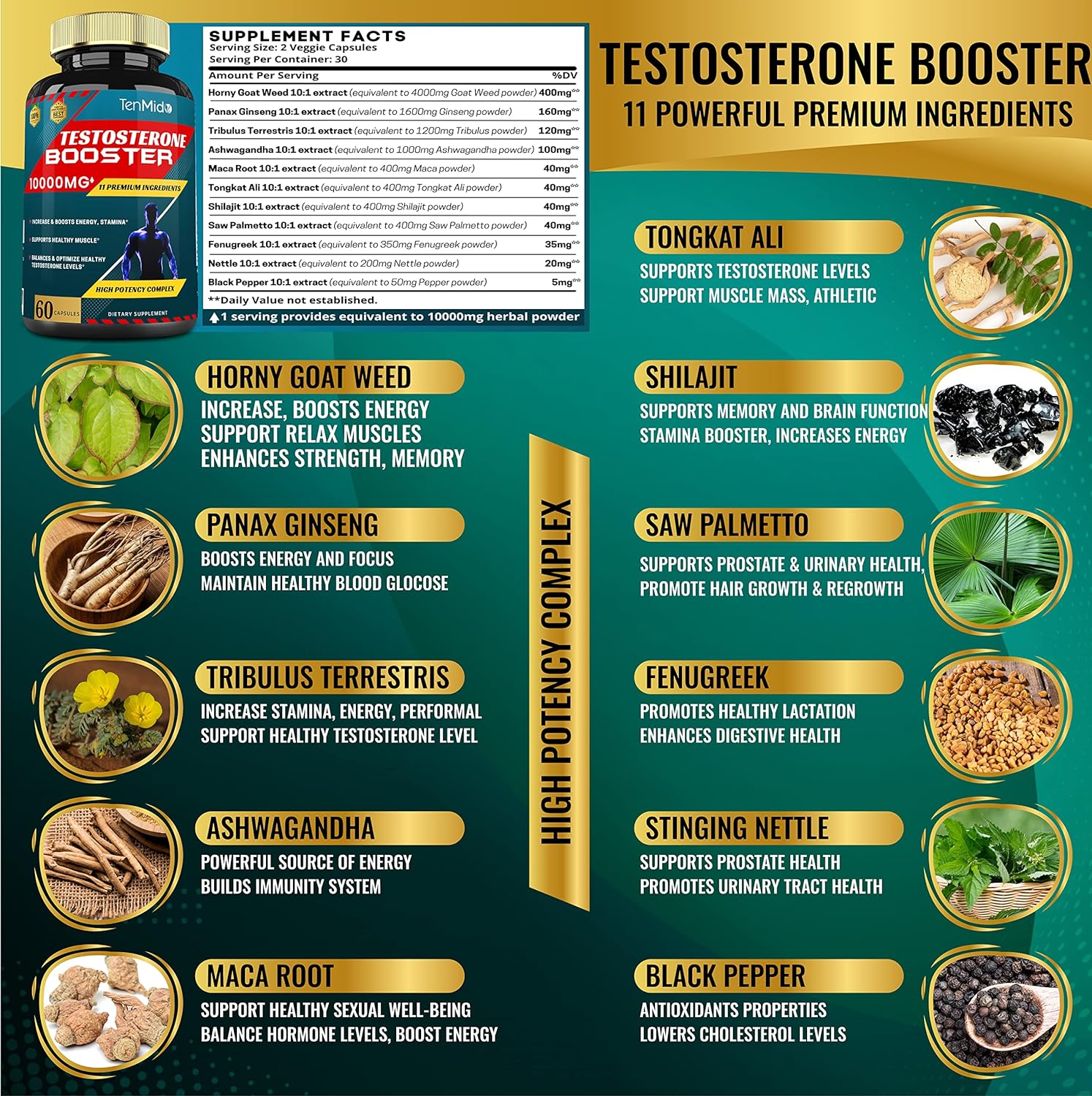 ?? High Potency Complex: Tenmido Testosterone Booster Supplement Extract Capsules combination equivalent to 10000mg highest quality powder with 10 extra powerful herbs problematic ingredients: Panax Ginseng, Tribulus Terrestris, Ashwagandha, Maca Root, Tongkat Ali, Shilajit, Saw Palmetto, Fenugreek, Nettle, Black Pepper. With the special optimized formula, our product has been shown to be one of the most advantageous herbs, highest absorption and bioavailability for your overall health