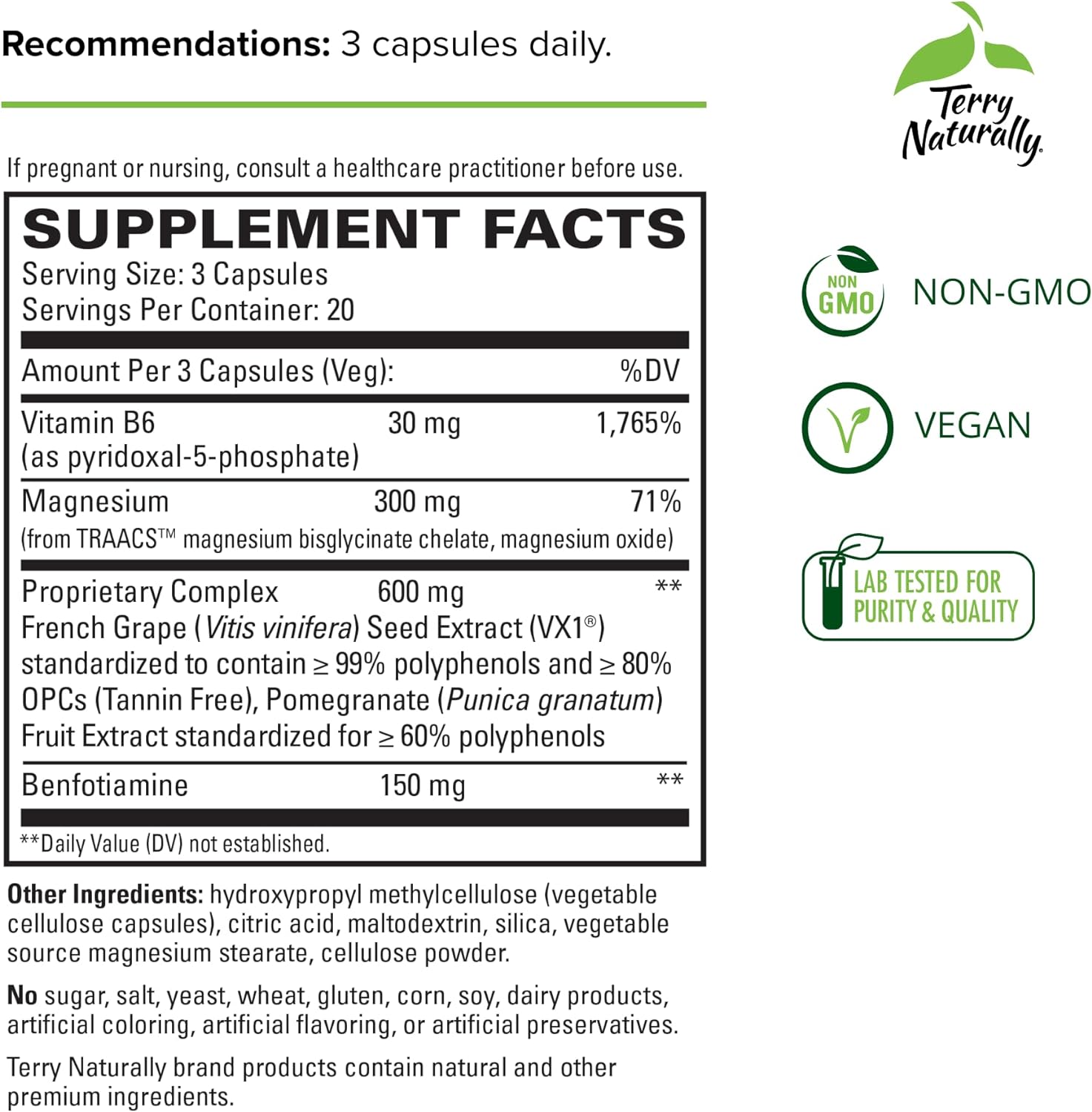 Influential Ingredients; Our formula combines French grape seed extract (VX1), pomegranate, benfotiamine, vitamin B6, and magnesium to help fill nutritional gaps in your diet