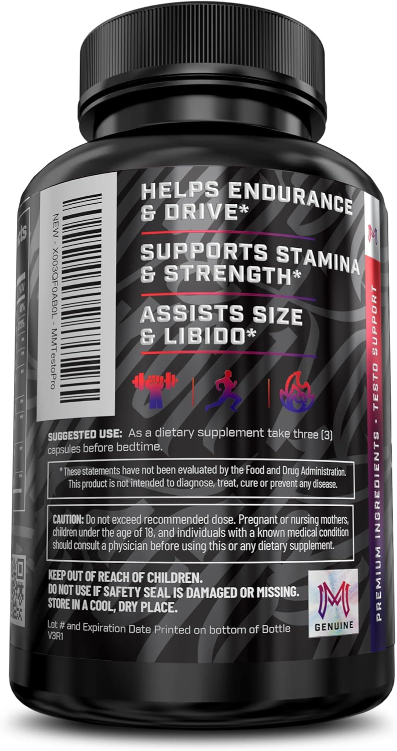 Boost your testosterone levels naturally with MuscleMotive TestoPro! This potent testosterone booster is designed to increase your strength, vitality, and overall wellness. Each capsule contains an effective blend of key minerals, including Magnesium and Zinc, critical for supporting healthy testosterone production. But we don't stop at just essential minerals. TestoPro also boasts a robust herbal blend, featuring potent extracts of Tribulus, Chrysin, Epimedium, Longjack, Saw Palmetto, Hawthorn, and Cissus Quadrangularis. These herbs have been chosen for their traditional use in supporting men's health, vitality, and endurance. Our priority is quality and safety. That's why we ensure that each capsule is made with non-GMO, gluten-free ingredients. Every batch of TestoPro is produced in a GMP certified facility in the USA, ensuring product consistency and quality. Each bottle of MuscleMotive TestoPro comes with 90 capsules, providing a one-month supply when taken as directed. Add TestoPro to your daily regimen and experience the difference a quality testosterone booster can make. Whether you're looking to enhance your workouts, improve recovery, or simply boost your daily energy levels, MuscleMotive TestoPro is your trusted partner for a healthier, more energized life