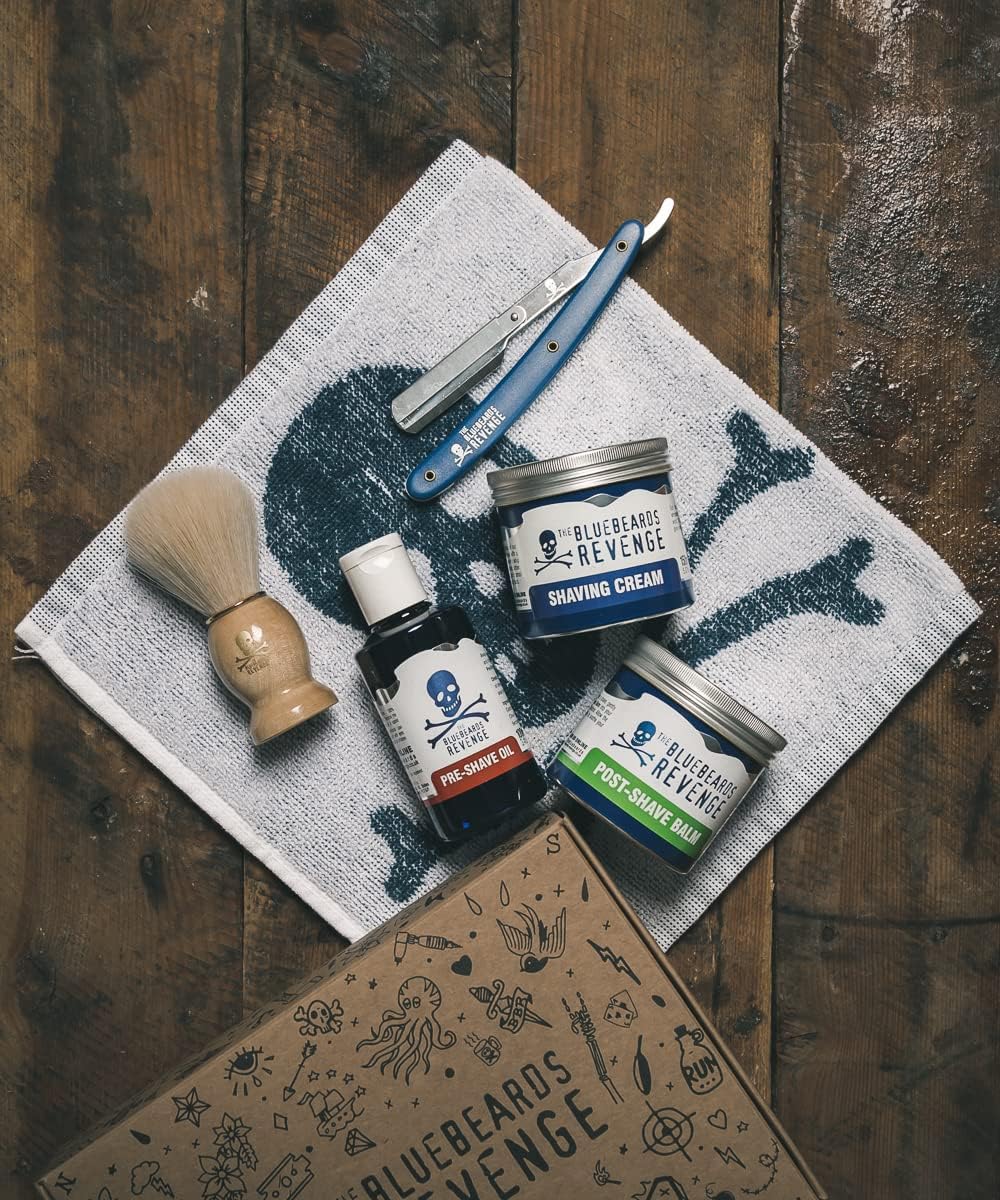The Bluebeards Revenge, Cut-Throat Shaving Set, Men’S 6 Piece Gift Set, Pre-Shave Oil, Shaving Cream, Post-Shave Balm, Doubloon Shaving Brush, Cut-Throat Razor & Shaving & Hand Towel