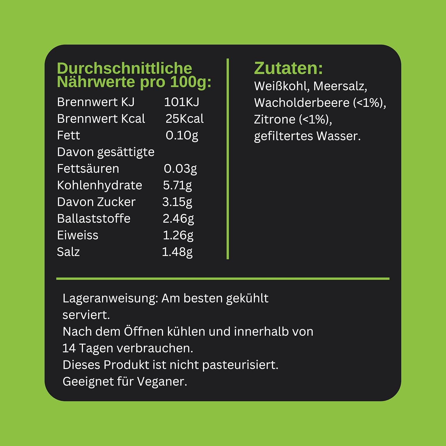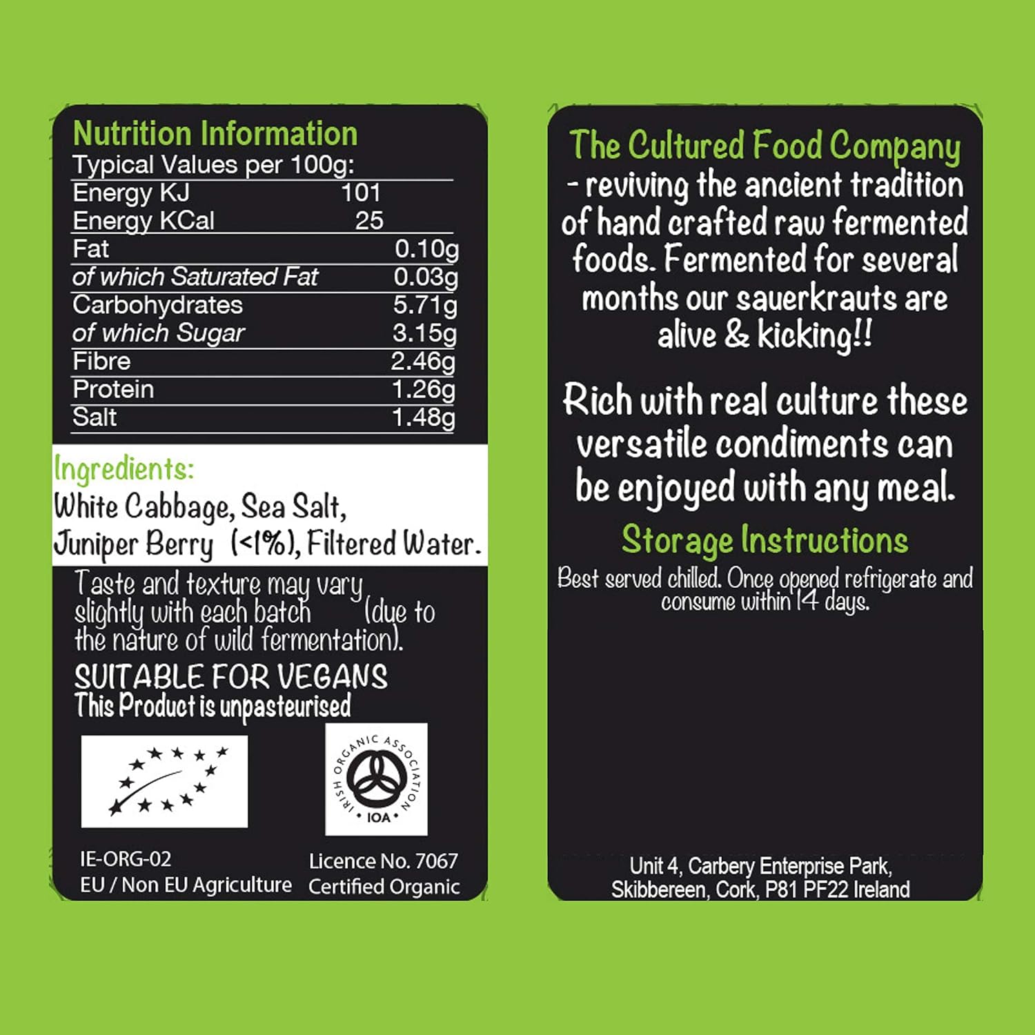 One of our simplest yet most delicious sauerkraut's. Zesty, fruity, fresh and flavourful, the juniper berries are fermented with cabbage infusing their flavour into the sauerkraut making this an incredibly versatile and tasty condiment. Barrel aged for several months and traditionally fermented this sauerkraut is unpasteurised and naturally rich in beneficial bacteria.These probiotics play a crucial role in promoting healthy gut flora, which supports digestion, nutrient absorption, and overall immune function. Eating this sauerkraut regularly can help maintain a balanced microbiome, improve digestion, and enhance your body’s natural defenses. Our product is 100% natural and organic, free from artificial additives, preservatives, and chemicals. It’s also completely vegan, making it suitable for anyone looking for a plant-based, health-supporting fermented food. Ideal as a flavourful side dish or a versatile ingredient in many recipes, this sauerkraut complements a wide variety of meals—from simple sandwiches and salads to gourmet dishes. It’s not only delicious but also a powerful functional food to help you achieve and maintain optimal wellness. Enjoy the rich tradition of fermentation with every bite, and nourish your body with this gut-friendly superfood,Certified Organic – Made with 100% certified organic white cabbage. Free from artificial chemicals, pesticides, and GMOs. Grown using ethical, sustainable farming,Raw & Unpasteurised – Never heat-treated or pasteurised, preserving all beneficial live bacteria, enzymes, and nutrients to deliver a truly nutritious sauerkraut beneficial for gut health,Gluten-Free & Vegan – Suitable for vegan, gluten-free, and paleo diets. Made without additives, preservatives, or artificial ingredients—just pure, fermented sauerkraut,Long Shelf Life – Naturally fermented to allow a long shelf life of up to 18 months when stored properly, perfect for stocking up and multipack purchases,Eco-friendly Packaging – Packaged in recyclable materials, reflecting our commitment to sustainability and helping to reduce environmental impact for a greener planet