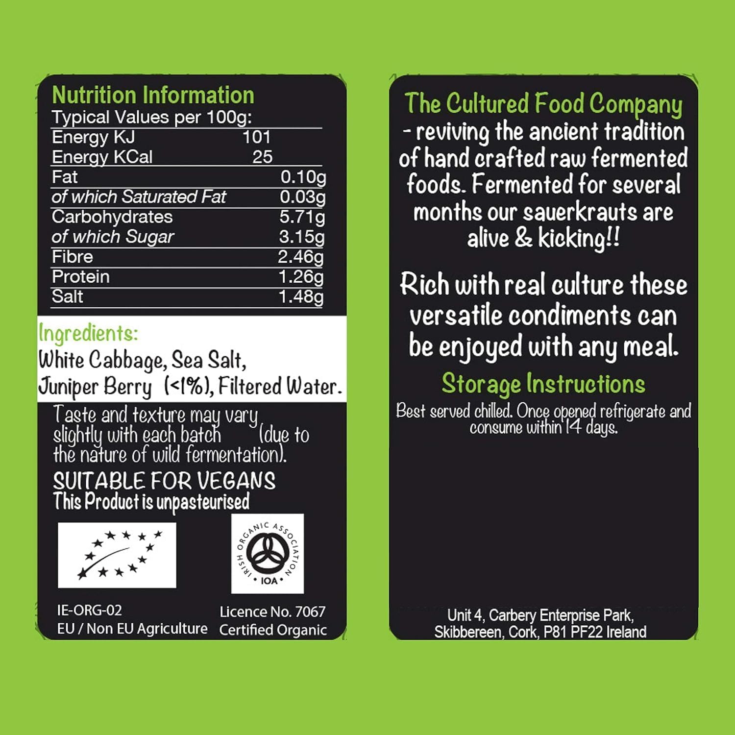 About this item Certified Organic – Made with 100% certified organic white cabbage. Free from artificial chemicals, pesticides, and GMOs. Grown using ethical, sustainable farming Raw & Unpasteurised – Never heat-treated or pasteurised, preserving all beneficial live bacteria, enzymes, and nutrients to deliver a truly nutritious sauerkraut beneficial for gut health Gluten-Free & Vegan – Suitable for vegan, gluten-free, and paleo diets. Made without additives, preservatives, or artificial ingredients—just pure, fermented sauerkraut Long Shelf Life – Naturally fermented to allow a long shelf life of up to 18 months when stored properly, perfect for stocking up and multipack purchases. Eco-friendly Packaging – Packaged in recyclable materials, reflecting our commitment to sustainability and helping to reduce environmental impact for a greener planet › See more product details,Certified Organic – Made with 100% certified organic white cabbage. Free from artificial chemicals, pesticides, and GMOs. Grown using ethical, sustainable farming,Raw & Unpasteurised – Never heat-treated or pasteurised, preserving all beneficial live bacteria, enzymes, and nutrients to deliver a truly nutritious sauerkraut beneficial for gut health,Gluten-Free & Vegan – Suitable for vegan, gluten-free, and paleo diets. Made without additives, preservatives, or artificial ingredients—just pure, fermented sauerkraut,Long Shelf Life – Naturally fermented to allow a long shelf life of up to 18 months when stored properly, perfect for stocking up and multipack purchases,Eco-friendly Packaging – Packaged in recyclable materials, reflecting our commitment to sustainability and helping to reduce environmental impact for a greener planet