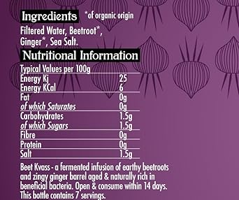 About this item Organic & Vegan Beet Tonic – Made with fermented organic beetroot, this vibrant vegan probiotic drink supports digestion, detox, and gut health while delivering a rich, earthy flavour. Unpasteurised & Raw for Maximum Probiotics – Our beet kvass is never heat-treated, preserving its natural enzymes and live cultures that promote healthy gut flora and digestive balance. Natural Detox & Immune Support – Rich in antioxidants and betalains from organic beets, this fermented drink supports liver function, detoxification, and natural immunity. Clean Ingredients & Traditional Fermentation – Crafted in small batches in West Cork using only organic beetroot, water, and sea salt. No preservatives, no added sugar, 100% clean-label. Functional Wellness Shot or Culinary Addition – Enjoy as a daily probiotic shot or add to soups, dressings, and savoury recipes for a tangy, nourishing boost of fermented flavour. › See more product details,Organic & Vegan Beet Tonic – Made with fermented organic beetroot, this vibrant vegan probiotic drink supports digestion, detox, and gut health while delivering a rich, earthy flavour,Unpasteurised & Raw for Maximum Probiotics – Our beet kvass is never heat-treated, preserving its natural enzymes and live cultures that promote healthy gut flora and digestive balance,Natural Detox & Immune Support – Rich in antioxidants and betalains from organic beets, this fermented drink supports liver function, detoxification, and natural immunity,Clean Ingredients & Traditional Fermentation – Crafted in small batches in West Cork using only organic beetroot, water, and sea salt. No preservatives, no added sugar, 100% clean-label,Functional Wellness Shot or Culinary Addition – Enjoy as a daily probiotic shot or add to soups, dressings, and savoury recipes for a tangy, nourishing boost of fermented flavour