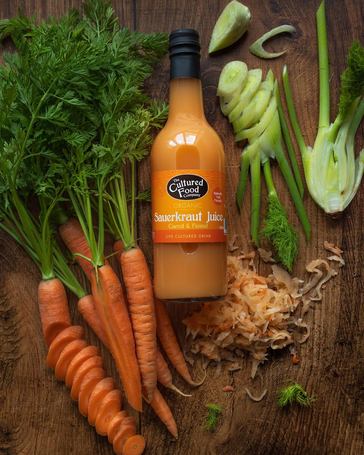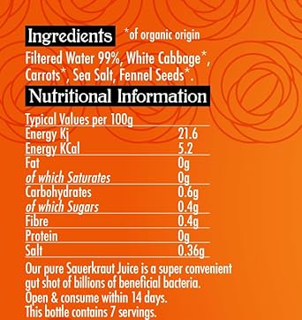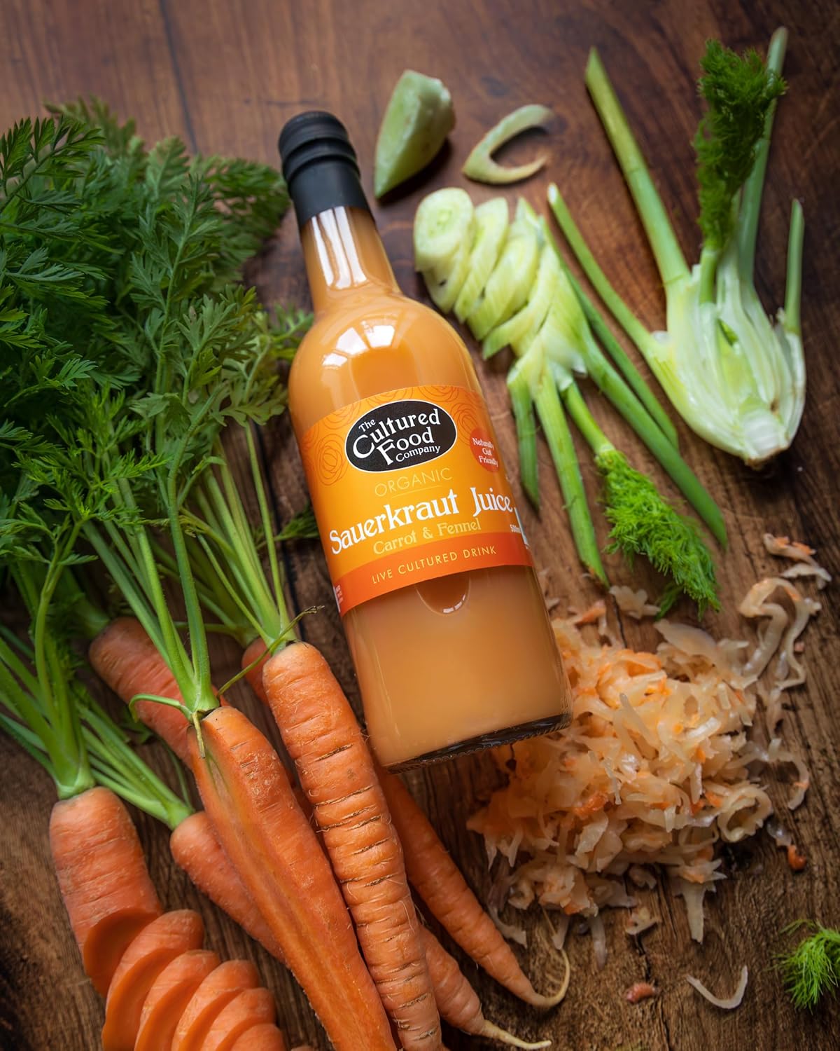 Product description Balance your gut naturally with the soothing and nourishing blend of The Cultured Food Company Organic Carrot & Fennel Sauerkraut Juice. This vibrant, unpasteurised juice combines the digestive power of fermented cabbage with the subtle sweetness of organic carrot and the aromatic, calming qualities of fennel. Crafted in small batches in West Cork, Ireland, this vegan, raw, and organic probiotic drink is made using traditional fermentation techniques and simple, clean ingredients. Each bottle is unpasteurised to retain all the live cultures, enzymes, and beneficial bacteria essential for digestive health and gut balance. Free from added sugar, preservatives, or artificial flavours, this juice offers a functional health boost that fits easily into your daily wellness routine. It’s ideal for those seeking a natural digestive aid, immune support, or simply a refreshing detox tonic with a twist. Whether you take it as a daily probiotic shot or incorporate it into cooking, this carrot and fennel juice adds both nutrition and flavour to your lifestyle. Use in salad dressings, soups, broths, or marinades to infuse dishes with tangy depth and a gentle fennel note. Nourish your gut, calm your system, and enjoy the benefits of fermented foods the natural way. Ingredients White Cabbage 88%*, Carrot 10%*, Sea Salt 2%, Fennel Seeds P.when('A').execute(function(A) { A.on('a:expander:toggle_description:toggle:collapse', function(data) { window.scroll(0, data.expander.$expander[0].offsetTop-100); }); }); Safety Warning Refrigerate after opening See more,Organic & Vegan Digestive Tonic – Made with organic carrots, fennel, and fermented cabbage, this probiotic drink supports digestion with a naturally sweet, aromatic flavour and gut-friendly live cultures,Unpasteurised & Raw for Maximum Benefit – Bottled fresh without pasteurisation, this carrot and fennel juice retains its natural probiotics and enzymes, supporting gut flora and digestive balance,Traditional Fermentation, Clean Ingredients – Crafted in West Cork using time-honoured methods, our juice contains no added sugar, preservatives, or artificial ingredients – just pure fermented goodness,Natural Support for Digestion & Wellness – Rich in lactic acid bacteria and nutrients from carrots and fennel, this juice promotes healthy digestion and may help reduce bloating and discomfort,Enjoy as a Wellness Shot or Kitchen Staple – Take daily as a detox juice or add to soups, broths, marinades or salad dressings for a unique, tangy twist with natural probiotic benefits