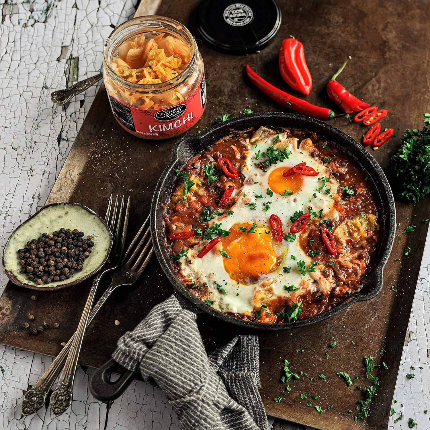 About this item Authentic Korean-Style Kimchi – Fermented napa cabbage and daikon radish blended with garlic, ginger, and fish sauce for a bold, tangy taste true to traditional Korean kimchi recipes. Contains Fish Sauce for Umami Depth – Not vegan, this kimchi gets its rich savoury flavour from traditional Korean fish sauce, adding complexity to your favourite kimchi noodles, ramen, or rice dishes. Naturally Fermented & Probiotic-Rich – Raw and unpasteurised, our kimchi supports gut health with living cultures and beneficial bacteria developed through natural fermentation. Perfect for Ramen, Noodles & More – Add to ramen noodles, stir-fries, rice bowls, wraps, or enjoy as a side with your favourite Asian-inspired meals. A simple way to bring heat and crunch. Crafted in Ireland, Inspired by Korea – Made in small batches in West Cork with real ingredients and no preservatives. We combine time-honoured fermentation with clean, Irish quality. › See more product details,Authentic Korean-Style Kimchi – Fermented napa cabbage and daikon radish blended with garlic, ginger, and fish sauce for a bold, tangy taste true to traditional Korean kimchi recipes,Contains Fish Sauce for Umami Depth – Not vegan, this kimchi gets its rich savoury flavour from traditional Korean fish sauce, adding complexity to your favourite kimchi noodles, ramen, or rice dishes,Naturally Fermented & Probiotic-Rich – Raw and unpasteurised, our kimchi supports gut health with living cultures and beneficial bacteria developed through natural fermentation,Perfect for Ramen, Noodles & More – Add to ramen noodles, stir-fries, rice bowls, wraps, or enjoy as a side with your favourite Asian-inspired meals. A simple way to bring heat and crunch,Crafted in Ireland, Inspired by Korea – Made in small batches in West Cork with real ingredients and no preservatives. We combine time-honoured fermentation with clean, Irish quality