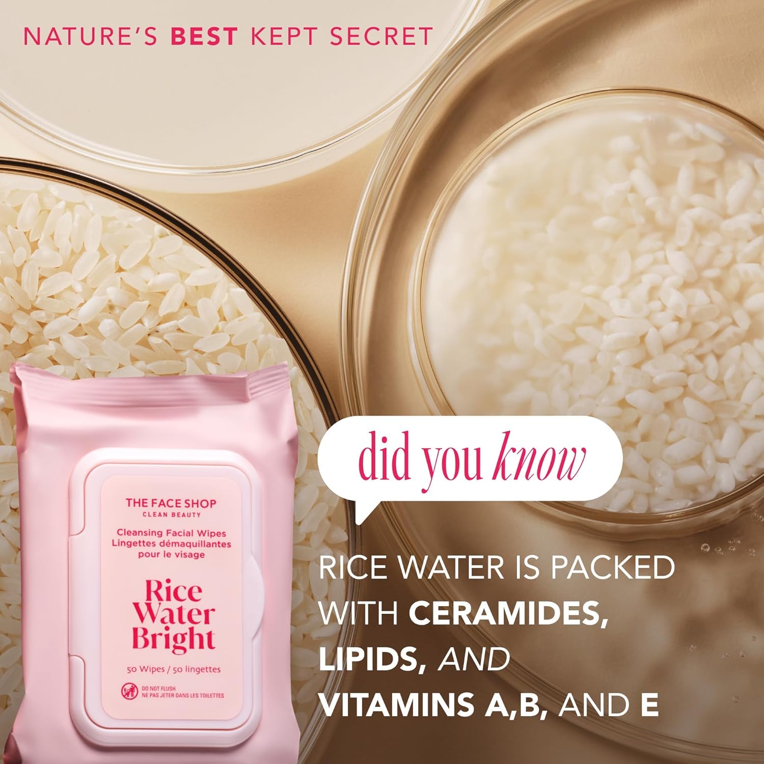 The Face Shop Rice Water Bright Makeup Remover Wipes For Face With Rice Extract, Brightening, Moisturizing, Infused With Cleansing Milk, Vegan Disposable Cleansing Facial Wipes, Korean Skin Care