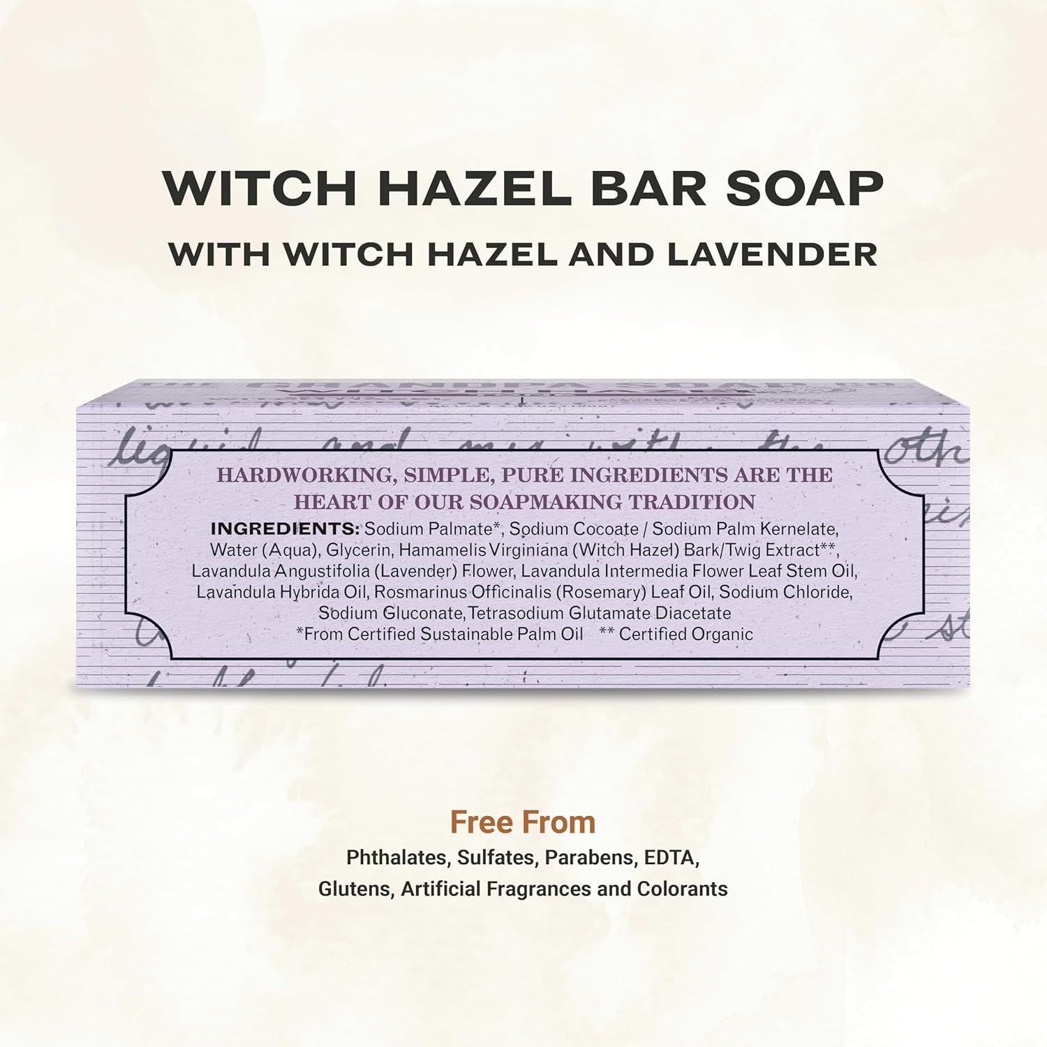 WITCH HAZEL BAR SOAP The astringent property of organic witch hazel is enhanced by relaxing lavender in a mild formula that gently tones the skin. Witch Hazel Bar Soap is the soap of choice after a long day’s work – made from ingredients that work as hard as you do