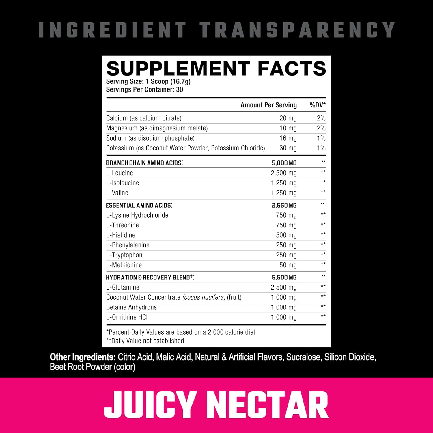 About this item 7.5 Grams Essential Amino Acids, including 5 grams of Branched Chain Amino Acids in 2:1:1 ratio 2.5 Grams Glutamine 1 gram Betaine Anhydrous 1 gram L-Ornithine 1 gram Coconut Water Powder Stimulant-Free › See more product details,7.5 Grams Essential Amino Acids, including 5 grams of Branched Chain Amino Acids in 2:1:1 ratio,2.5 Grams Glutamine,1 gram Betaine Anhydrous,1 gram L-Ornithine,1 gram Coconut Water Powder,Stimulant-Free