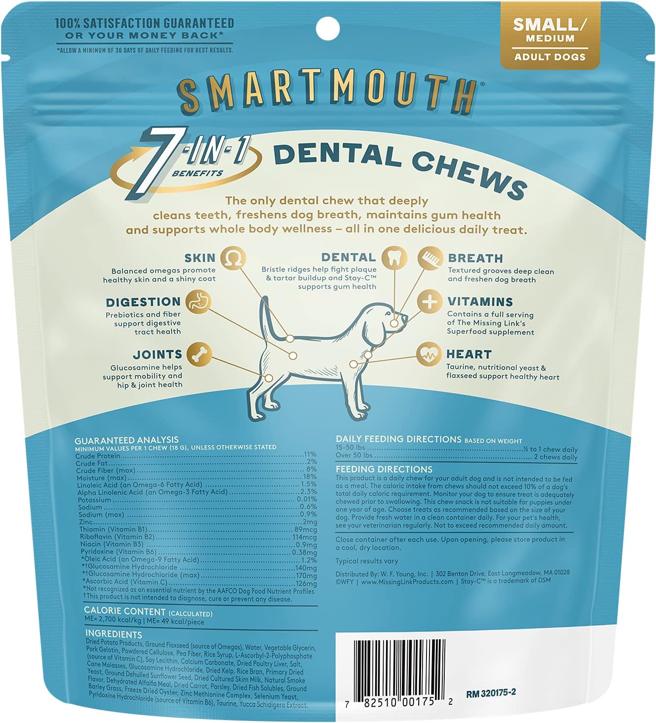 The Missing Link Smartmouth Vet Developed Dental Chew Treats, 7-In-1 Benefits: Healthy Teeth & Gums, Breath, Skin, Joints, Digestion, Heart, Immune System β Small/Medium 15-50Lb Dogs, 14 Ct