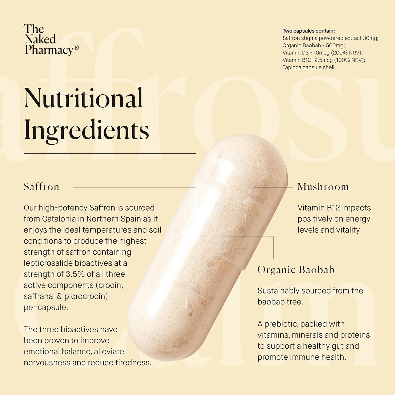 The Naked Pharmacy | Saffrosun Calm | Balance & Energy | Saffron With Vitamin B12 | High Strength | Natural No Additives | Vegan | 30 Capsules