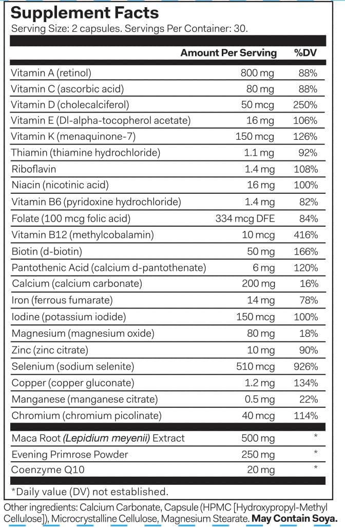 3 >CLEAN INGREDIENTS β We only use clinically proven, rigorously tested ingredients in our formulas to ensure optimum safety and efficacy. WOMEN'S MULTI VITAMIN 45+ includes Vitamin D, Vitamin B12, Magnesium and evening primrose powder