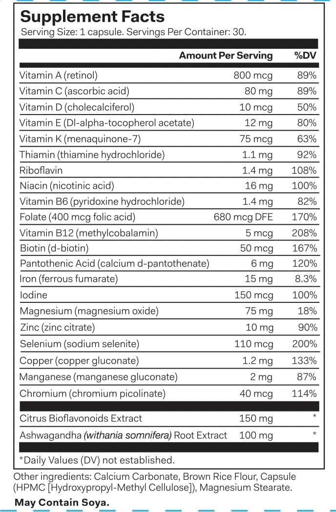 3 >CLEAN INGREDIENTS β We only use clinically proven, rigorously tested ingredients in our formulas to ensure optimum safety and efficacy. MULTI VITAMIN WOMEN includes Vitamin C, Folate, Magnesium and Ashwagandha
