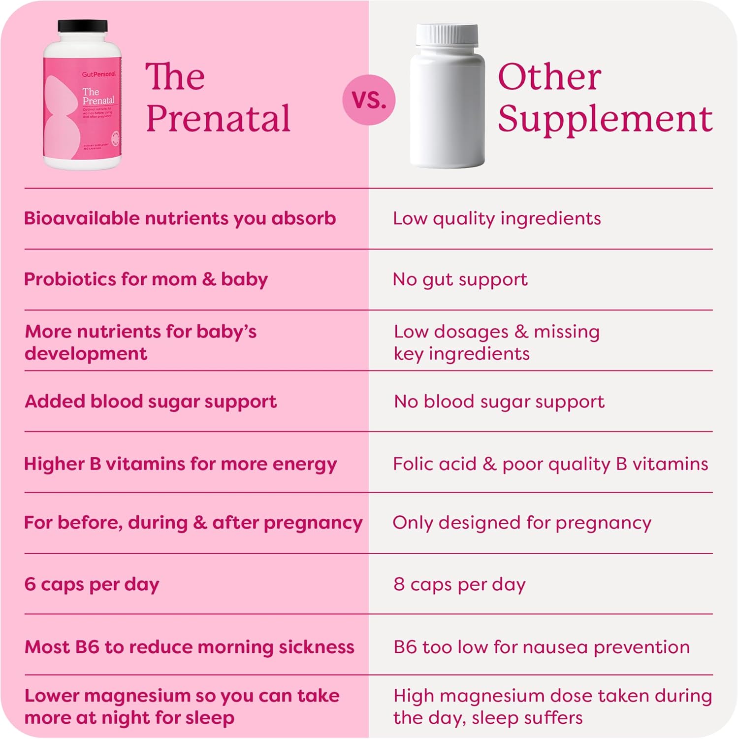 About this item Elevate your prenatal and postnatal experience with GutPersonal's The Prenatal. It stands out as a high-quality and comprehensive multivitamin, carefully crafted to support preconception, pregnancy, and postpartum phases. Designed for both mom and baby, The Prenatal delivers an optimal blend of essential nutrients, including enhanced levels of folate and B12, promoting a healthy baby and providing sustained energy for the mother. Experience balancing nutritional support with The Prenatal, setting it apart as the go-to choice for expecting mothers. The inclusion of extra B6 helps alleviate morning sickness, ensuring a smoother journey through pregnancy. Prioritize gut health for both mom and baby. Incorporate The Prenatal into your routine ideally 6 months to 1 year before conception. Continue the support throughout pregnancy and postpartum, including breastfeeding. Take 3 capsules with breakfast and 3 capsules with lunch, always with complete meals. GutPersonal is committed to your optimal health. Driven by scientific research and high-quality ingredients, we believe in the power of a healthy gut for optimal well-being. See more product details,Elevate your prenatal and postnatal experience with GutPersonal's The Prenatal. It stands out as a high-quality and comprehensive multivitamin, carefully crafted to support preconception, pregnancy, and postpartum phases,Designed for both mom and baby, The Prenatal delivers an optimal blend of essential nutrients, including enhanced levels of folate and B12, promoting a healthy baby and providing sustained energy for the mother,Experience balancing nutritional support with The Prenatal, setting it apart as the go-to choice for expecting mothers. The inclusion of extra B6 helps alleviate morning sickness, ensuring a smoother journey through pregnancy,Prioritize gut health for both mom and baby. Incorporate The Prenatal into your routine ideally 6 months to 1 year before conception. Continue the support throughout pregnancy and postpartum, including breastfeeding. Take 3 capsules with breakfast and 3 capsules with lunch, always with complete meals,GutPersonal is committed to your optimal health. Driven by scientific research and high-quality ingredients, we believe in the power of a healthy gut for optimal well-being